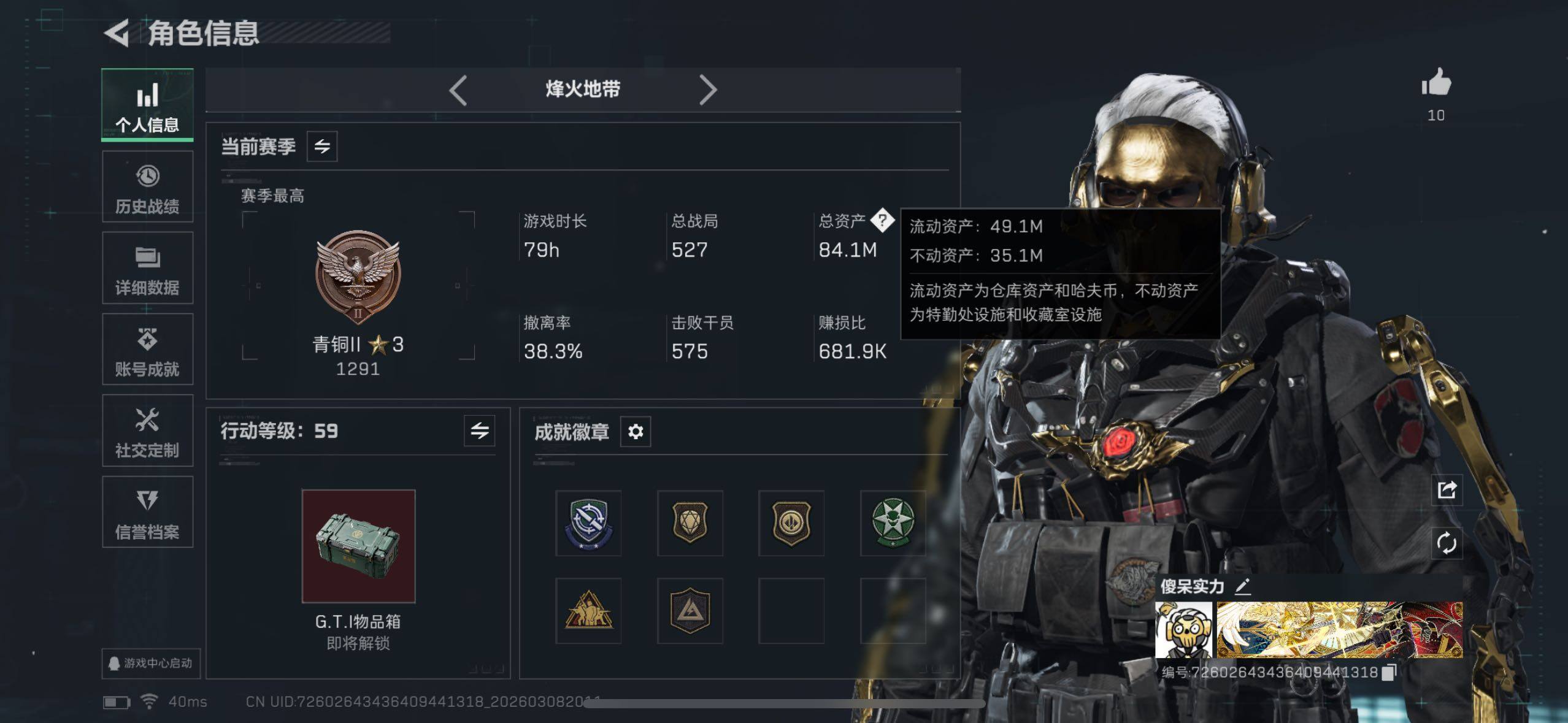 [17448571]84m总资产-4953k哈伏币-59烽火等级-青铜-14战场等级-列兵