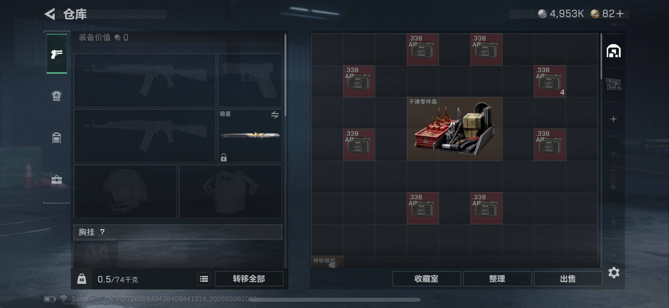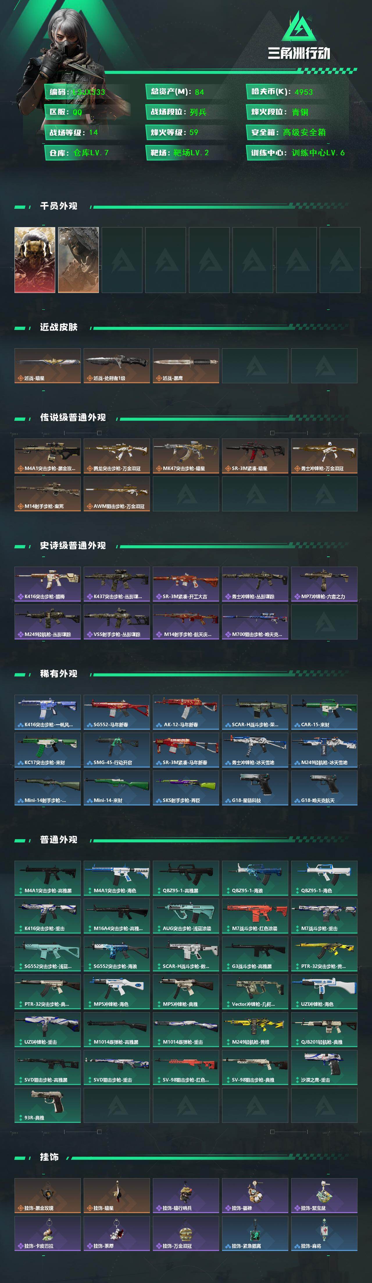 [17448571]84m总资产-4953k哈伏币-59烽火等级-青铜-14战场等级-列兵 【干员外观】:红狼-蚀金玫瑰,乌鲁鲁-荒原猎手 【近战皮肤】:近战-暗星,近战-处刑者1级,近战-黑鹰 【传说外观】:M4A1突击步枪-蚀金玫瑰,腾龙突击步枪-万金泪冠,MK47突击步枪-暗星,SR-3M紧凑突击步枪-暗星,勇士冲锋枪-万金泪冠,M14射手步枪-蛮荒,AWM狙击步枪-万金泪冠 【史诗外观】:K416突击步枪-腊梅,K437突击步枪-丛影谍踪,SR-3M紧凑突击步枪-开工大吉,勇士冲锋枪-丛影谍踪,MP7冲锋枪-六套之力,M249轻机枪-丛影谍踪,VSS射手步枪-丛影谍踪, M14射手步枪-航天庆典,M700狙击步枪-哈夫克警备 【稀有外观】:K416突击步枪-一帆风顺,SG552突击步枪-马年新春, AK-12突击步枪-马年新春,SCAR-H战斗步枪-荣耀列队,CAR-15突击步枪-来财,KC17突击步枪-来财,SMG-45冲锋枪-行动开启,SR-3M紧凑突击步枪-马年新春,勇士冲锋枪-冰天雪地,M249轻机枪-冰天雪地,Mini-14射手步枪-荣耀列队,Mini-14射手步枪-来财,SKS射手步枪-弄臣,QSZ92G-一帆风顺,G18-星链科技,G18-哈夫克航天 【普通外观】:M4A1突击步枪-高雅黑,M4A1突击步枪-海色,QBZ95-1突击步枪-高雅黑,QBZ95-1突击步枪-海浪,QBZ95-1突击步枪-海色,K416突击步枪-重击,M16A4突击步枪-高雅黑,AUG突击步枪-浅蓝涂装,M7战斗步枪-红色涂装,M7战斗步枪-重击,SG552突击步枪-浅蓝涂装,SG552突击步枪-海浪,SG552突击步枪-狂欢,SCAR-H战斗步枪-数码迷彩,G3战斗步枪-高雅黑,PTR-32突击步枪-黄蜂,PTR-32突击步枪-典雅,CAR-15突击步枪-狂欢,MP5冲锋枪-海色,MP5冲锋枪-典雅,Vector冲锋枪-几何迷彩,UZI冲锋枪-海色,UZI冲锋枪-重击,UZI冲锋枪-狂欢,M1014霰弹枪-高雅黑,M1014霰弹枪-重击,M249轻机枪-黄蜂,QJB201轻机枪-典雅,SVD狙击步枪-高雅黑,SVD狙击步枪-重击,SR-25射手步枪-黑巧甜心,SV-98狙击步枪-红色涂装,SV-98狙击步枪-典雅,沙漠之鹰-重击,93R-典雅 【挂饰】:挂饰-蚀金玫瑰,挂饰-暗星,挂