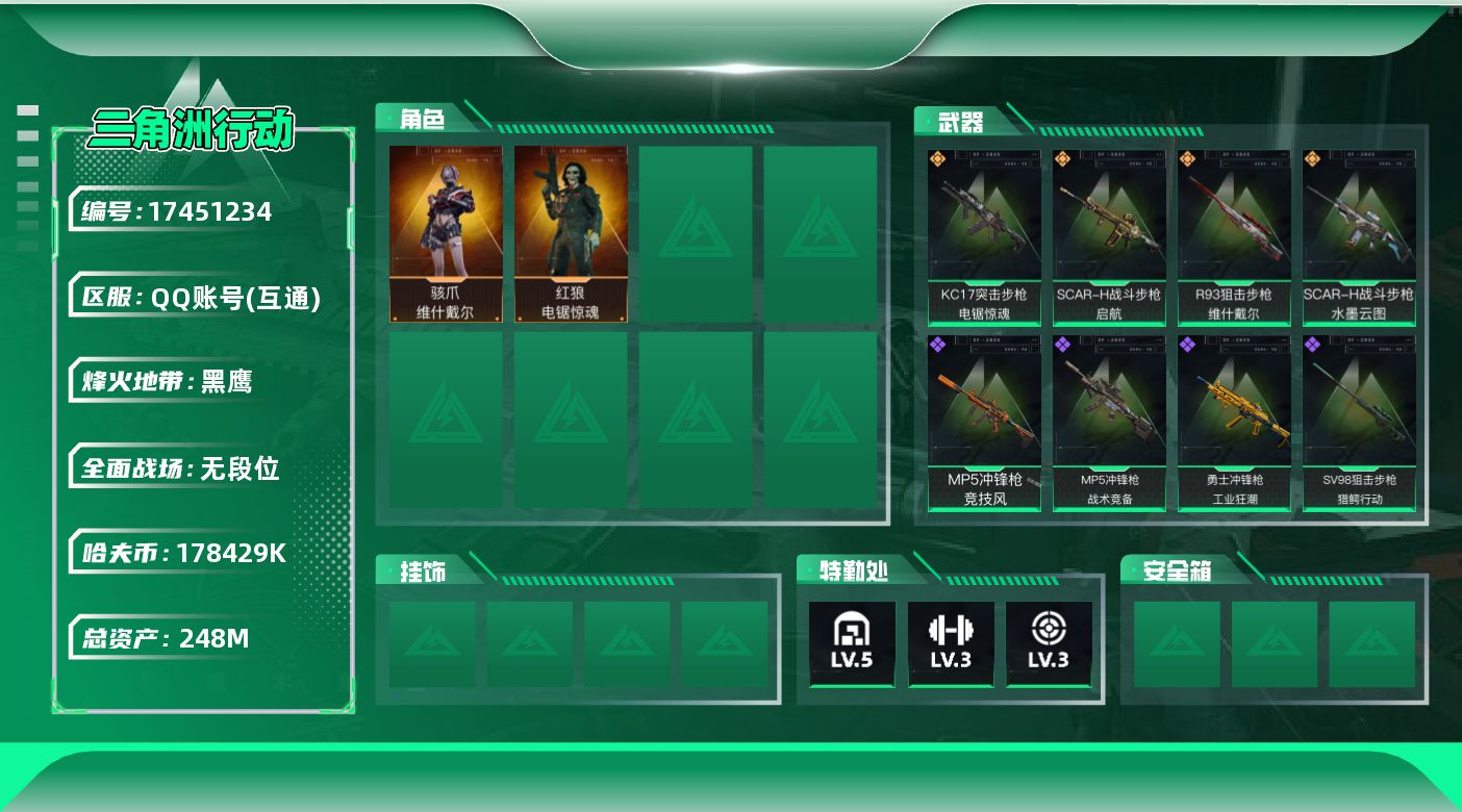[17451234]【店主推荐捡漏号!可直接换绑】178429k哈伏币-244m流动资产-60烽火等级-黑鹰-1战场等级-无军衔 【干员外观】:骇爪-维什戴尔,红狼-电锯惊魂 【近战皮肤】:近战-黑鹰 【传说外观】:SCAR-H战斗步枪-水墨云图,SCAR-H战斗步枪-启航,KC17突击步枪-电锯惊魂,R93狙击步枪-维什戴尔 【史诗外观】:MP5冲锋枪-战术竞备,MP5冲锋枪-竞技风,勇士冲锋枪-工业狂潮,M250通用机枪-囚徒,SV-98狙击步枪-猎鳄行动 【稀有外观】:AKM突击步枪-肃杀,QBZ95-1突击步枪-公平竞技,M7战斗步枪-捣蛋鬼,SCAR-H战斗步枪-荣耀列队,MP5冲锋枪-哈夫克卫队,P90冲锋枪-黄昏,P90冲锋枪-捣蛋鬼,Vector冲锋枪-先锋,SMG-45-行动开启,SMG-45冲锋枪-幻影结构,勇士冲锋枪-冰天雪地,QJB201轻机枪-哈夫克卫队,Mini-14射手步枪-荣耀列队,SV-98狙击步枪-星链科技,SV-98狙击步枪-哈夫克航天,SV-98狙击步枪-精英联盟 【普通外观】:M4A1突击步枪-粉色涂装,M4A1突击步枪-海色,QBZ95-1突击步枪-海浪,QBZ95-1突击步枪-海色,K416突击步枪-几何迷彩,AUG突击步枪-浅蓝涂装,SG552突击步枪-海浪,SCAR-H战斗步枪-数码迷彩,MP5冲锋枪-海色,MP5冲锋枪-黄蜂,Vector冲锋枪-几何迷彩,野牛冲锋枪-高雅黑,M1014霰弹枪-海浪,M249轻机枪-黄蜂,M250通用机枪-条纹,SVD狙击步枪-高雅黑,SR-25射手步枪-黄蜂,QSZ92G-条纹,沙漠之鹰-海浪,沙漠之鹰-高雅黑 【载具外观】:轮式突击炮-荣耀 【军牌】:军牌-装备修理,军牌-静谧时光,军牌-来点薯条,军牌-幸福国,军牌-信誉优秀 【挂饰】:挂饰-阿萨拉盾兵,挂饰-维什戴尔,挂饰-阿萨拉狙击兵*2,挂饰-阿萨拉霰弹兵,挂饰-诡影狙击兵*3,挂饰-诡影喷火兵,挂饰-崩岩重炮,挂饰-启程,挂饰-阿萨拉徽章*5