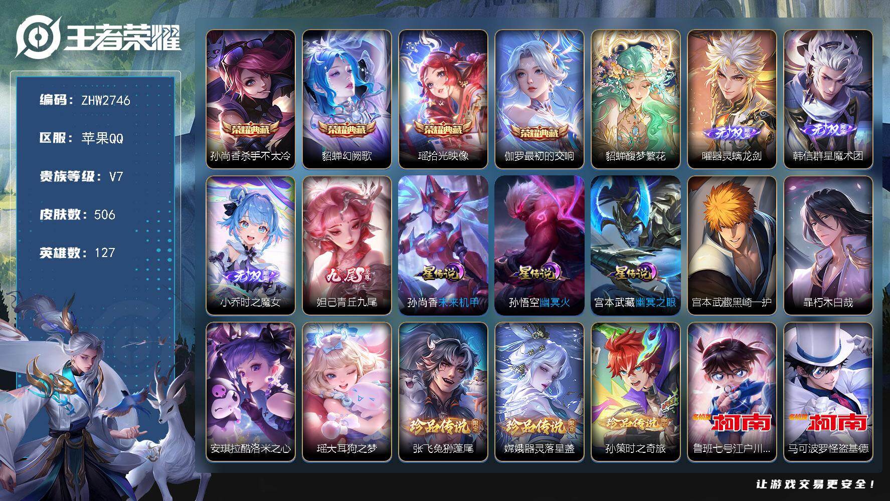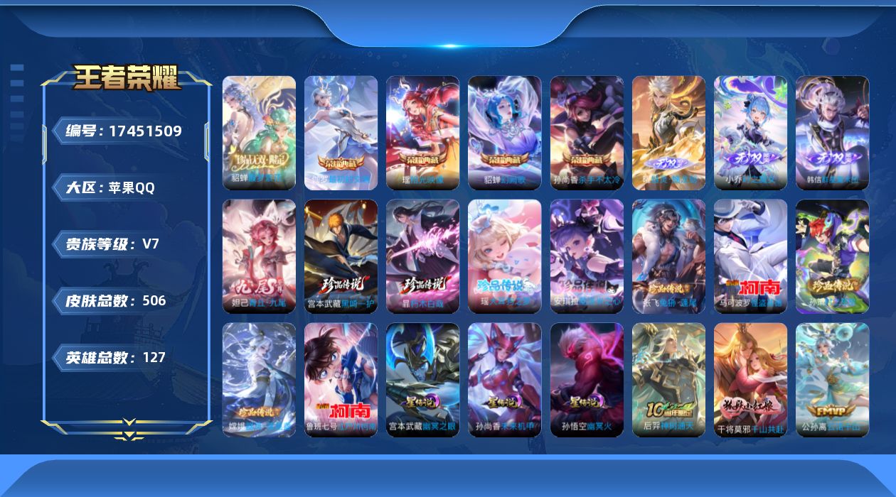 [17451509]苹果Q-V7-尊贵铂金I段位-127英雄-506皮肤-4典藏皮肤-1珍品无双-4无双-9珍品传说-50传说-167史诗