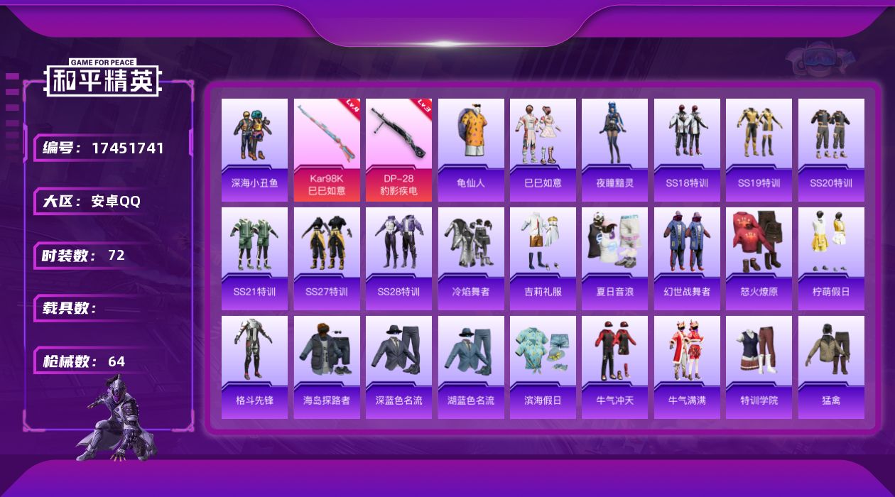 [17451741]【店主推荐捡漏号】安卓 手Q-1粉装-3特效枪-0载具-0粉色飞行器-20875热力值-3王牌印记-72套装-64枪皮【热门品类】:套装-深海小丑鱼,套装-龟仙人【粉色套装】:角色-虹云熊熊【粉色枪皮等级】:Kar98K-巳巳如意(四级),Mk14-福马献瑞(四级),DP-28-豹影疾电(三级)【粉色枪皮】:Kar98K-巳巳如意,Mk14-福马献瑞,DP-28-豹影疾电