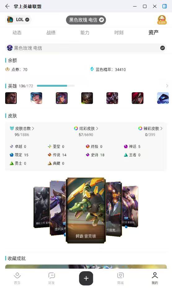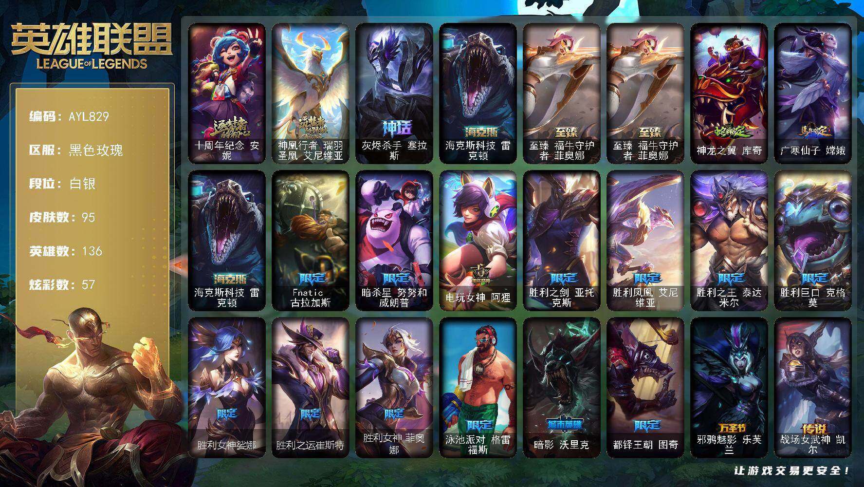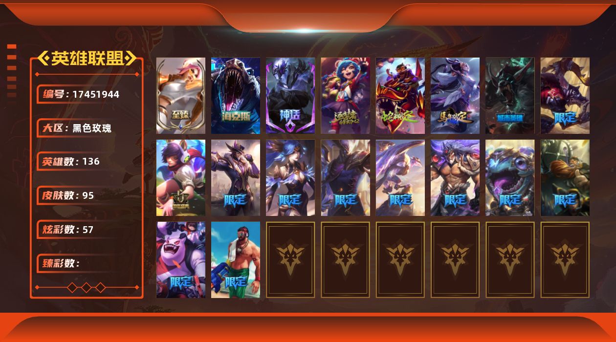 [17451944]白银段位-136英雄-95皮肤-57炫彩-0终极-5神话-15限定-14传说-18史诗