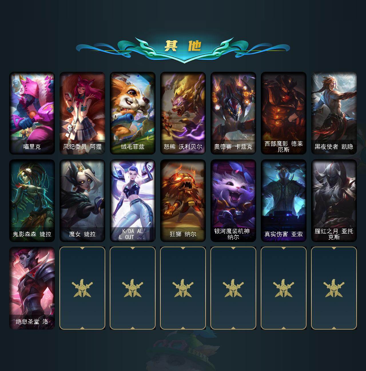 【其他皮肤1】:赵云子龙,魔女乐芙兰,弗拉基米尔伯爵,学生会长弗拉基米尔,玉剑传说无极,星之守护者索拉卡,荒野女警厄运小姐,睡衣守护者厄运小姐,武神贾克斯,王子不是我阿木木,忍龟拉莫斯,嗜血行刑蒙多,先驱行者卡萨丁,昔日霸主普朗克,柯基库奇,欧米伽小队天雷爆破手,创世之神特朗德尔,电玩女神凯特琳,暮色枪骑布里茨,战斗学院卡特琳娜,幻影梦魔魔腾,星河战队雷克顿,鳄霸雷克顿,吕布奉先,黑色玫瑰假面舞会伊莉丝,热带丛林兰博,魔女卡西奥佩娅,远土之灵斯卡纳,喵里克,风纪委员阿狸,绒毛菲兹,怒熊沃利贝尔,奥德赛卡兹克,西部魔影德莱厄斯,黑夜使者凯隐,鬼影森森婕拉,魔女婕拉,KDAALLOUT卡莎,狂狮纳尔,银河魔装机神纳尔,真实伤害亚索,腥红之月亚托克斯,绝息圣堂洛