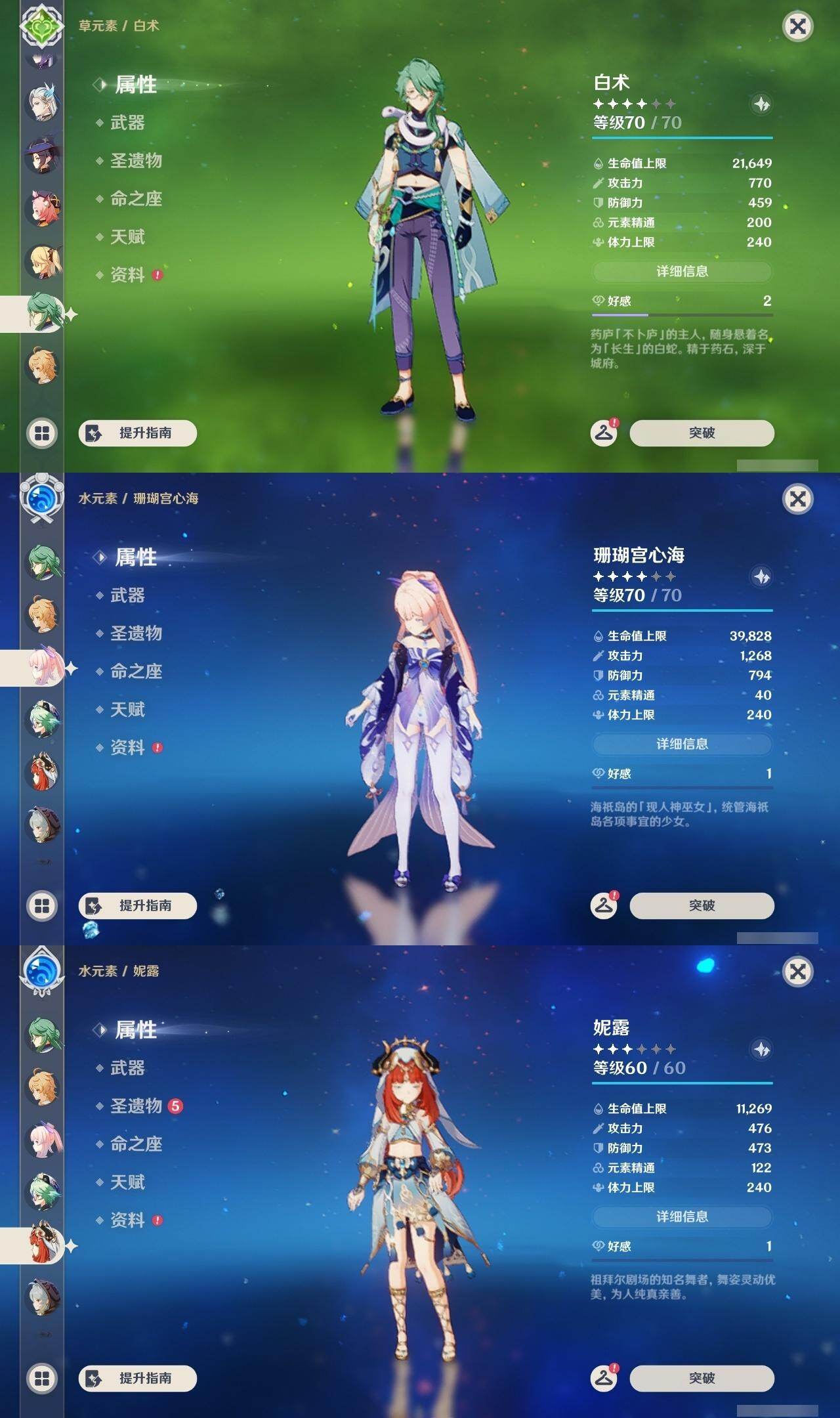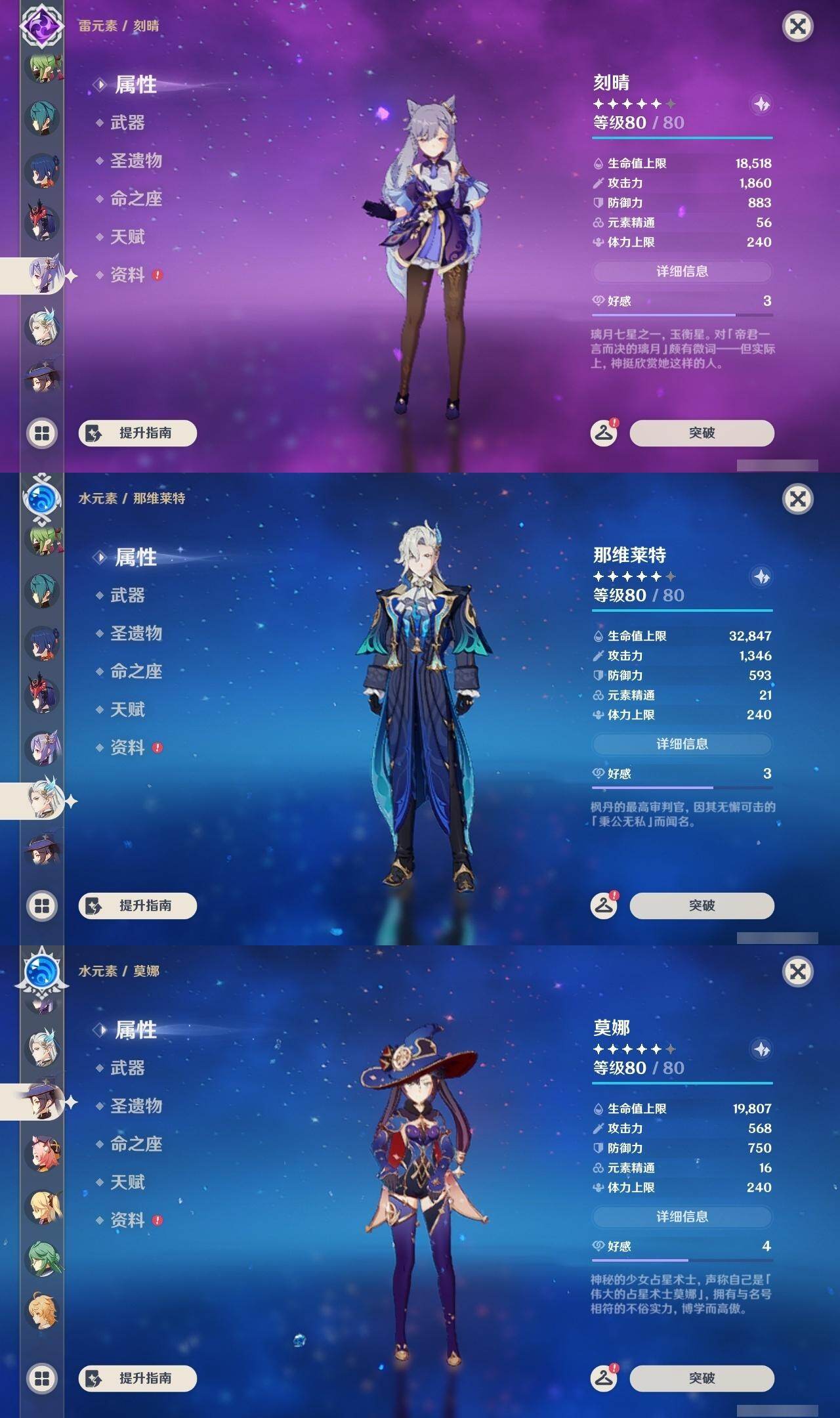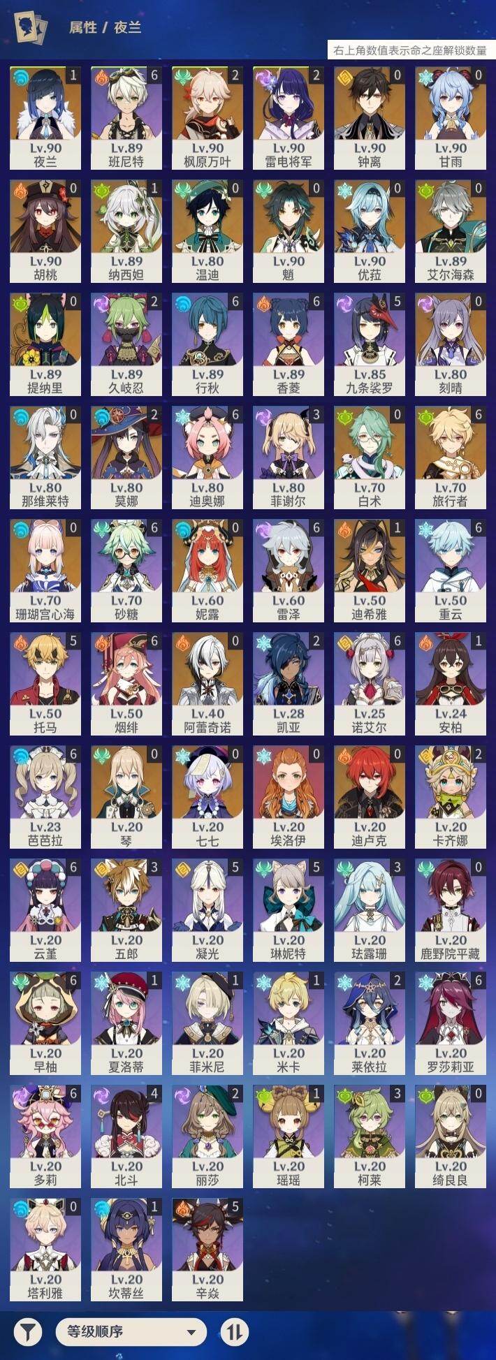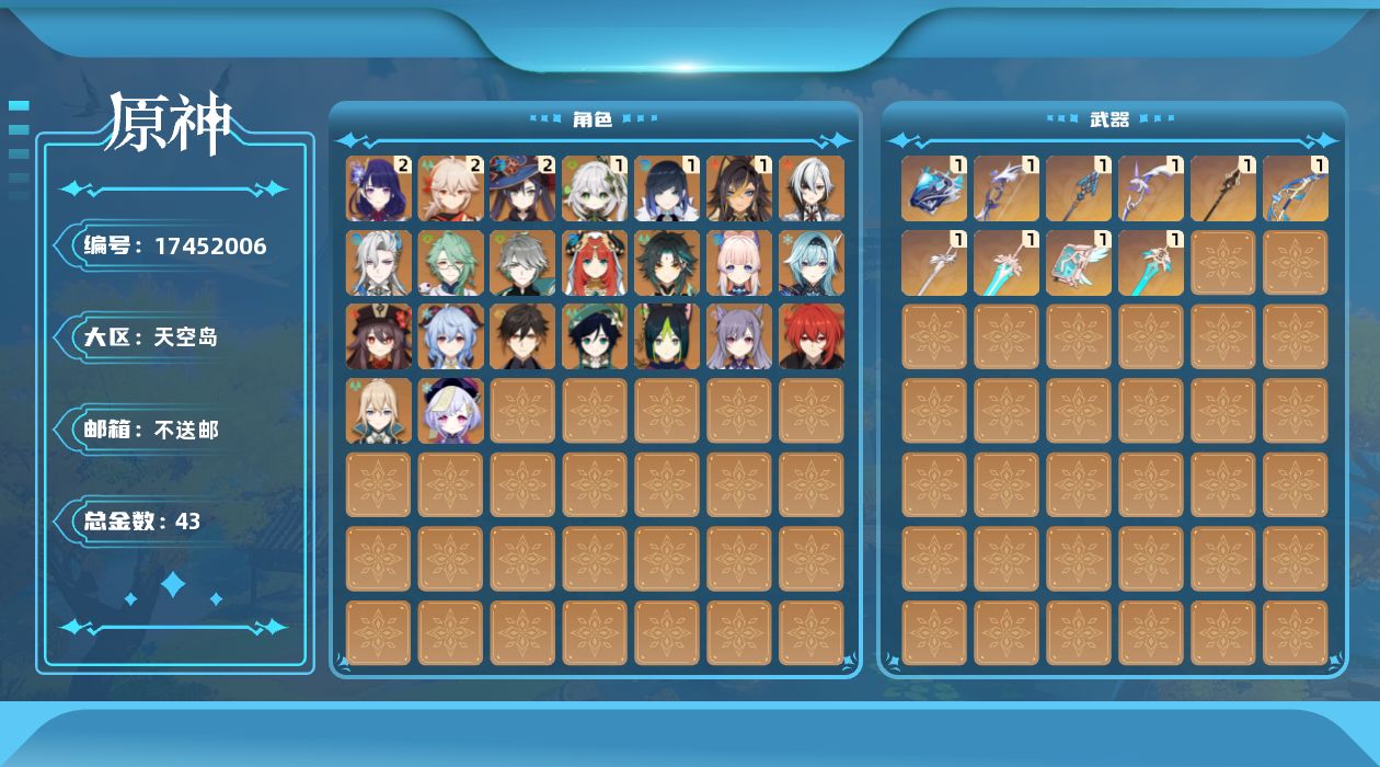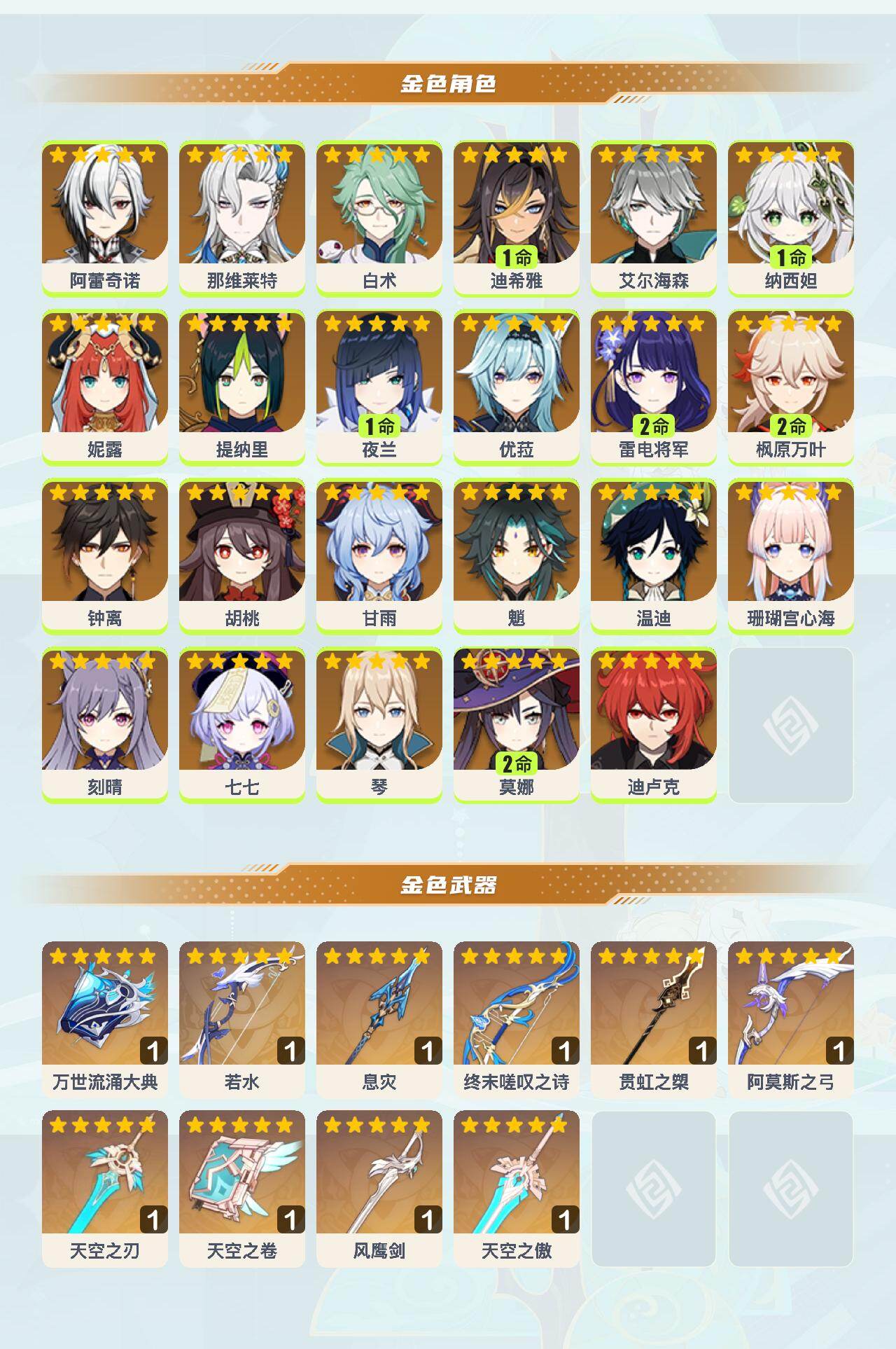 0命阿蕾奇诺,0命那维莱特,0命白术,1命迪希雅,0命艾尔海森,1命纳西妲,0命妮露,0命提纳里,1命夜兰,0命优菈,2命雷电将军,2命枫原万叶,0命钟离,0命胡桃,0命甘雨,0命魈,0命温迪,0命珊瑚宫心海,0命刻晴,0命七七,0命琴,2命莫娜,0命迪卢克,精1万世流涌大典,精1若水,精1息灾,精1终末嗟叹之诗,精1贯虹之槊,精1阿莫斯之弓,精1天空之刃,精1天空之卷,精1风鹰剑,精1天空之傲