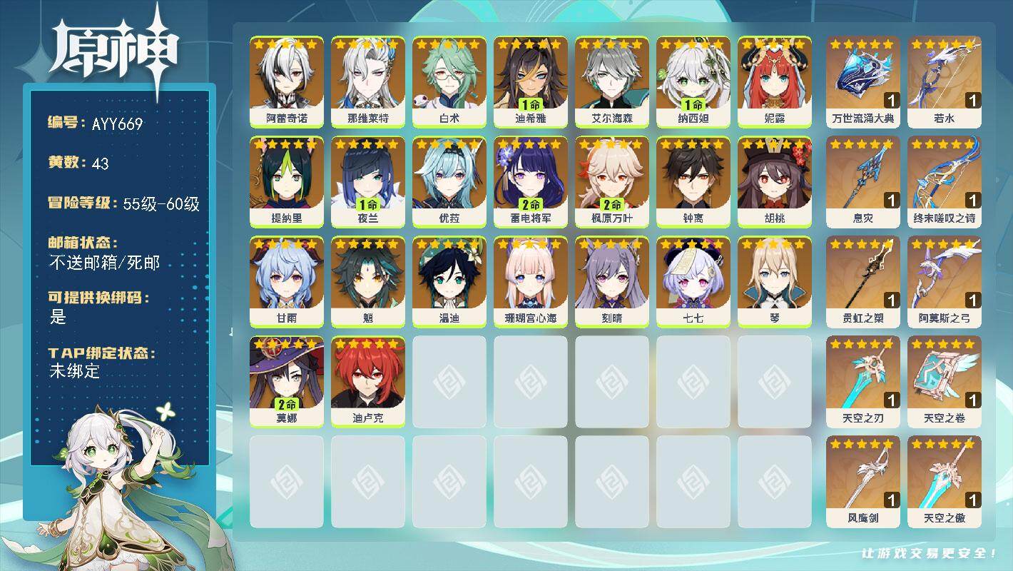 [17452006]58级/43黄/男主/23个五星角色/11个五星武器 0命阿蕾奇诺,0命那维莱特,0命白术,1命迪希雅,0命艾尔海森,1命纳西妲,0命妮露,0命提纳里,1命夜兰,0命优菈,2命雷电将军,2命枫原万叶,0命钟离,0命胡桃,0命甘雨,0命魈,0命温迪,0命珊瑚宫心海,0命刻晴,0命七七,0命琴,2命莫娜,0命迪卢克,精1万世流涌大典,精1若水,精1息灾,精1终末嗟叹之诗,精1贯虹之槊,精1阿莫斯之弓,精1天空之刃,精1天空之卷,精1风鹰剑,精1天空之傲