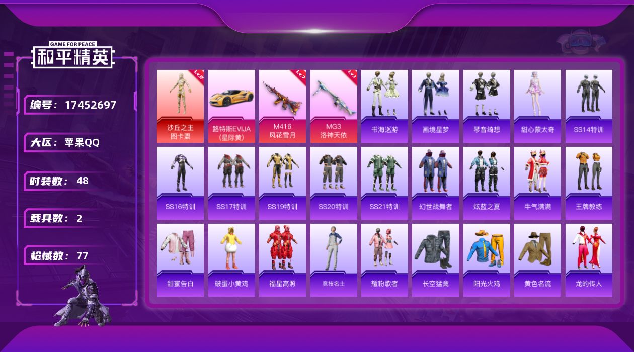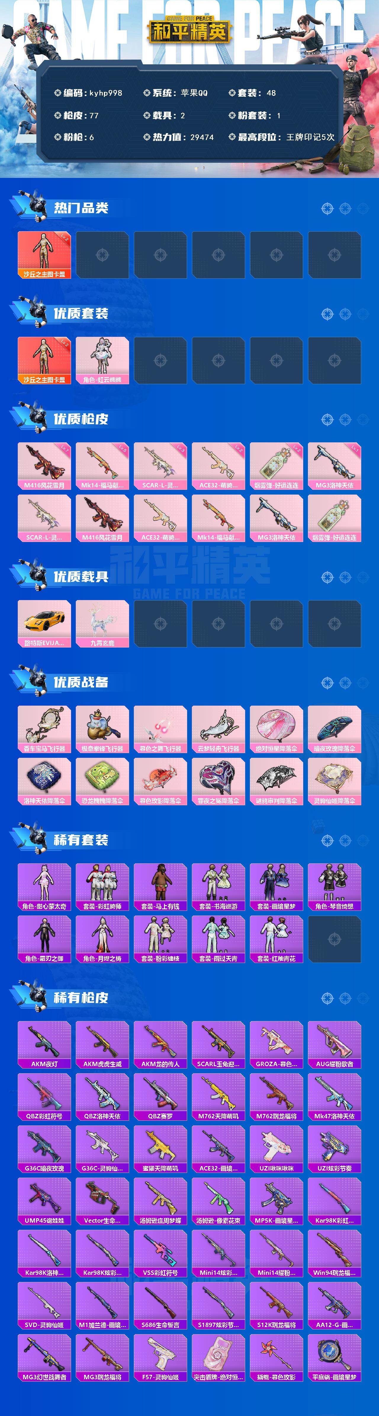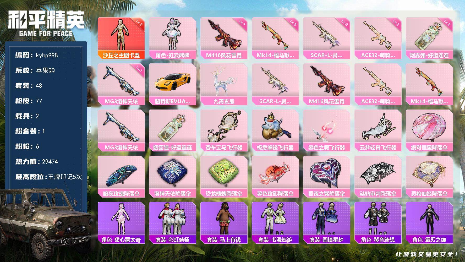 [17452697]苹果 手Q-1神装-1粉装-6特效枪-2载具-5粉色飞行器-29474热力值-5王牌印记-48套装-77枪皮