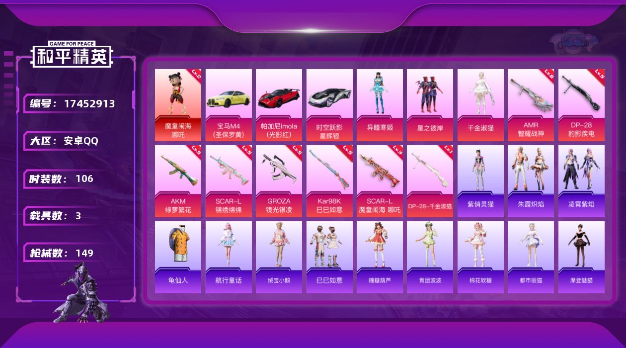 [17452913]安卓 手Q-1神装-3粉装-9特效枪-3载具-1粉色飞行器-48327热力值-3王牌印记-106套装-149枪皮