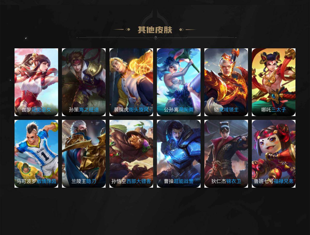 【其他皮肤】:兰陵王金庭之子,苏烈千军破阵,钟馗驱傩正仪,张良缤纷绘卷,程咬金演武夺筹,杨戬次元傲视,狄仁杰万华元夜,鬼谷子原初探秘者,老夫子醍醐杖,盾山圆桌骑士,明世隐疑决卦,弈星混沌棋,沈梦溪星空之诺,苏烈坚韧之力,狂铁命运角斗场,钟无艳海滩丽影,关羽龙腾万里,刘备纽约教父,狄仁杰阴阳师,宫本武藏万象初新,花木兰兔女郎,亚瑟死亡骑士,典韦黄金武士,扁鹊化身博士,赵云忍炎影,达摩大发明家,露娜哥特玫瑰,韩信教廷特使,项羽海滩派对,澜孤猎,蒙恬秩序猎龙将,蒙犽归虚梦演,曜归虚梦演,盘古创世神祝,嫦娥露花倒影,上官婉儿修竹墨客,伽罗花见巫女,孙策海之征途,裴擒虎街头旋风,公孙离花间舞,铠龙域领主,哪吒三太子,马可波罗激情绿茵,兰陵王隐刃,孙悟空西部大镖客,曹操超能战警,狄仁杰锦衣卫,鲁班七号福禄兄弟