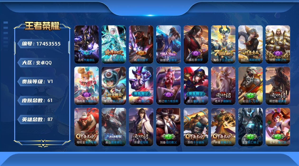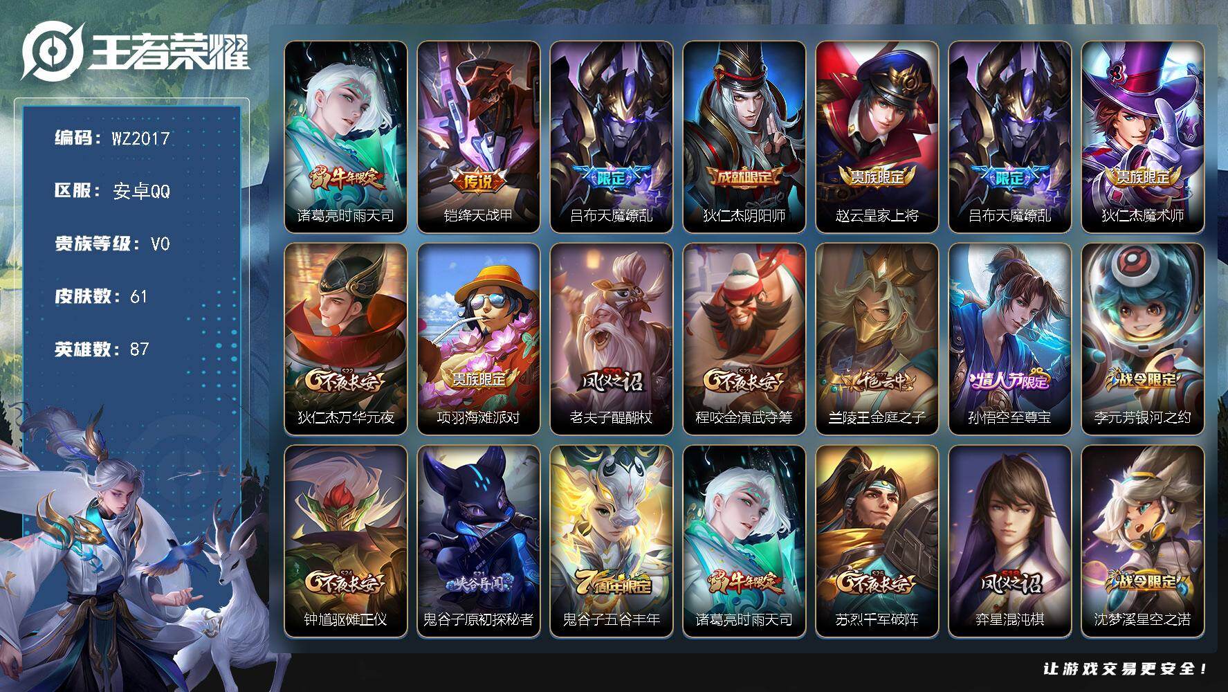 [17453555]安卓Q-61皮肤-3传说-10史诗 【传说皮肤】:诸葛亮时雨天司,铠绛天战甲,吕布天魔缭乱 【限定皮肤】:狄仁杰阴阳师,赵云皇家上将,吕布天魔缭乱,狄仁杰魔术师,狄仁杰万华元夜,项羽海滩派对,老夫子醍醐杖,程咬金演武夺筹,兰陵王金庭之子,孙悟空至尊宝,李元芳银河之约,钟馗驱傩正仪,鬼谷子原初探秘者,鬼谷子五谷丰年,诸葛亮时雨天司,苏烈千军破阵,弈星混沌棋,沈梦溪星空之诺,明世隐疑决卦 【年限皮肤】:诸葛亮时雨天司 【赛季限定】:弈星混沌棋,明世隐疑决卦,老夫子醍醐杖,鬼谷子原初探秘者,狄仁杰万华元夜,程咬金演武夺筹,钟馗驱傩正仪,苏烈千军破阵,兰陵王金庭之子 【战令限定】:李元芳银河之约,沈梦溪星空之诺 【史诗皮肤】:鬼谷子五谷丰年,橘右京修罗,李元芳银河之约,狄仁杰鹰眼统帅,孙悟空至尊宝,妲己魅力维加斯,孙尚香水果甜心,狄仁杰魔术师,赵云皇家上将,项羽苍穹之光 【其他皮肤】:兰陵王金庭之子,苏烈千军破阵,钟馗驱傩正仪,张良缤纷绘卷,程咬金演武夺筹,杨戬次元傲视,狄仁杰万华元夜,鬼谷子原初探秘者,老夫子醍醐杖,盾山圆桌骑士,明世隐疑决卦,弈星混沌棋,沈梦溪星空之诺,苏烈坚韧之力,狂铁命运角斗场,钟无艳海滩丽影,关羽龙腾万里,刘备纽约教父,狄仁杰阴阳师,宫本武藏万象初新,花木兰兔女郎,亚瑟死亡骑士,典韦黄金武士,扁鹊化身博士,赵云忍炎影,达摩大发明家,露娜哥特玫瑰,韩信教廷特使,项羽海滩派对,澜孤猎,蒙恬秩序猎龙将,蒙犽归虚梦演,曜归虚梦演,盘古创世神祝,嫦娥露花倒影,上官婉儿修竹墨客,伽罗花见巫女,孙策海之征途,裴擒虎街头旋风,公孙离花间舞,铠龙域领主,哪吒三太子,马可波罗激情绿茵,兰陵王隐刃,孙悟空西部大镖客,曹操超能战警,狄仁杰锦衣卫,鲁班七号福禄兄弟 【营地ID】:1859280092