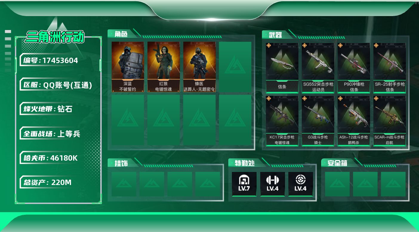 [17453604]【店主推荐捡漏号!可直接换绑】46180k哈伏币-201m流动资产-60烽火等级-钻石-27战场等级-上等兵 【干员外观】:蜂医-送葬人·无题密令,深蓝-不破誓约,红狼-电锯惊魂 【近战皮肤】:近战-信条,近战-黑鹰 【传说外观】:M4A1突击步枪-蚀金玫瑰,M4A1突击步枪-阿米娅,ASh-12战斗步枪-鹅鸭杀,SG552突击步枪-运动员,AK-12突击步枪-特斯拉线圈,SCAR-H战斗步枪-启航,G3战斗步枪-骑士,CAR-15突击步枪-阿米娅,腾龙突击步枪-捞点薯条,KC17突击步枪-电锯惊魂,P90冲锋枪-信条,UZI冲锋枪-特斯拉线圈,SR-3M紧凑突击步枪-特斯拉线圈,勇士冲锋枪-能天使-午夜邮差,QCQ171冲锋枪-鹅鸭杀,725双管霰弹枪-送葬人-无题密令,M250通用机枪-骑士之心,QJB201轻机枪-鹅鸭杀,SR-25射手步枪-信条,R93狙击步枪-维什戴尔,AWM狙击步枪-捞点薯条,93R-捞点薯条,复合弓-黑·天际线 【史诗外观】:ASh-12战斗步枪-无极限,M16A4突击步枪-竞赛选手,AUG突击步枪-蝮蛇,G3战斗步枪-流沙送葬,AS Val突击步枪-典狱官,AS Val突击步枪-百步穿杨,腾龙突击步枪-无垢,腾龙突击步枪-猎鳄行动,K437突击步枪-守护者,MP5冲锋枪-深海恐惧,MP5冲锋枪-战术竞备,MP5冲锋枪-竞技风,Vector冲锋枪-阿萨拉文明,Vector冲锋枪-异域战争,SR-3M紧凑突击步枪-荒野求生,SR-3M紧凑突击步枪-战术竞备,勇士冲锋枪-工业狂潮,MP7冲锋枪-无垢,MP7冲锋枪-守护者,PKM通用机枪-荒野求生,M250通用机枪-囚徒,Mini-14射手步枪-守护者,SVD狙击步枪-荒野求生,PSG-1射手步枪-无垢,SV-98狙击步枪-林中猎手,SV-98狙击步枪-囚徒,M700狙击步枪-竞技风,M700狙击步枪-蝮蛇,M700狙击步枪-百步穿杨,AWM狙击步枪-无极限,复合弓-守护者 【稀有外观】:M4A1突击步枪-零点,M4A1突击步枪-繁盛,AKM突击步枪-战术演练,AKM突击步枪-肃杀,QBZ95-1突击步枪-公平竞技,ASh-12战斗步枪-繁盛,K416突击步枪-碳纤维,K416突击步枪-虎啸,M16A4突击步枪-街头涂鸦,M7战斗步枪-捣蛋鬼,AK-12突击步枪-零点,SCAR-H战斗步枪