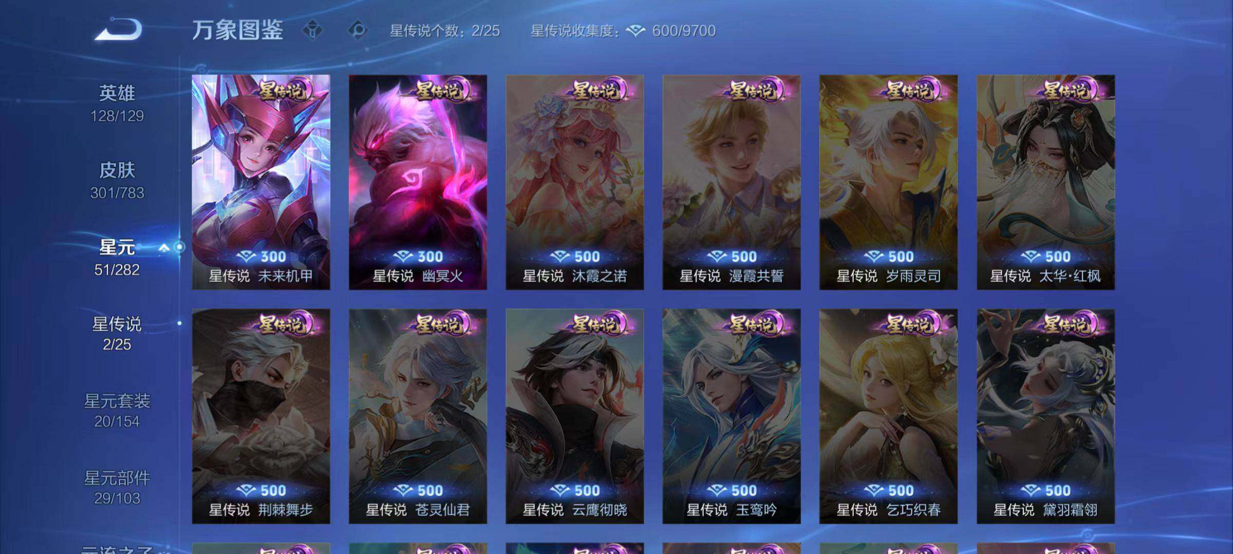 芈月重明,典韦穷奇,盾山御銮,明世隐疑决卦,老夫子醍醐杖,鬼谷子原初探秘者,狄仁杰万华元夜,程咬金演武夺筹,钟馗驱傩正仪,苏烈千军破阵,吕布猎兽之王,钟馗神迹守卫,鲁班七号狮舞东方,沈梦溪星空之诺,李元芳银河之约,刘邦夺宝奇兵,马可波罗暗影游猎,蒙犽狂想玩偶喵,元歌云间偶戏,弈星混沌棋,达摩沙漠行僧,兰陵王金庭之子,沈梦溪大漠名商,李元芳云中旅人,桑启海盐诗旅,裴擒虎擒涛扼浪,鲁班大师探海日志,张良古海寻踪