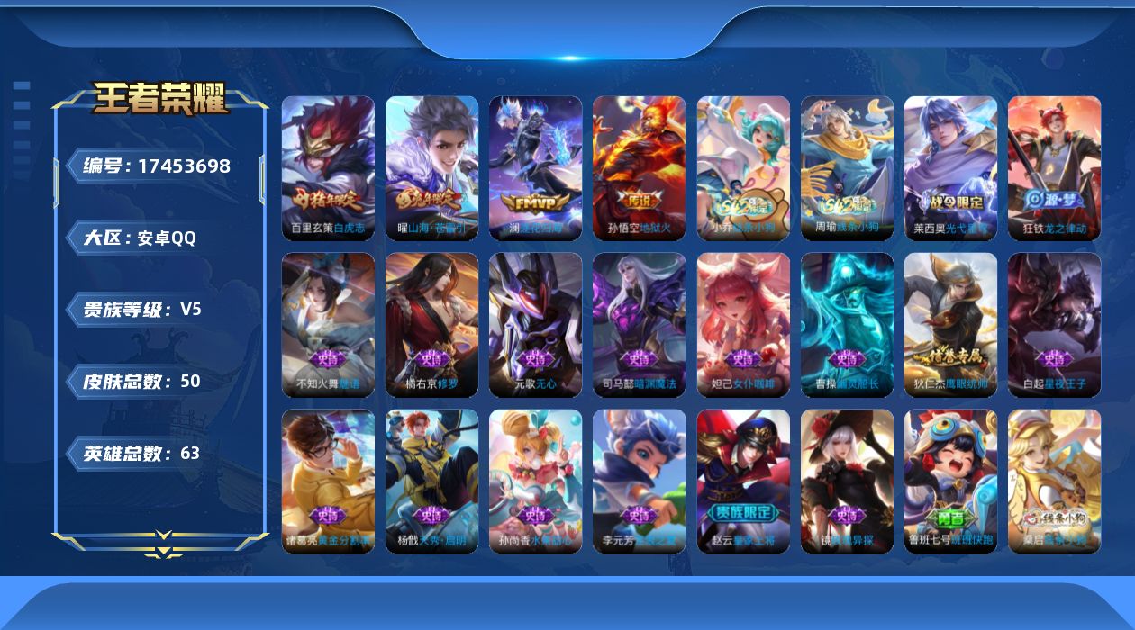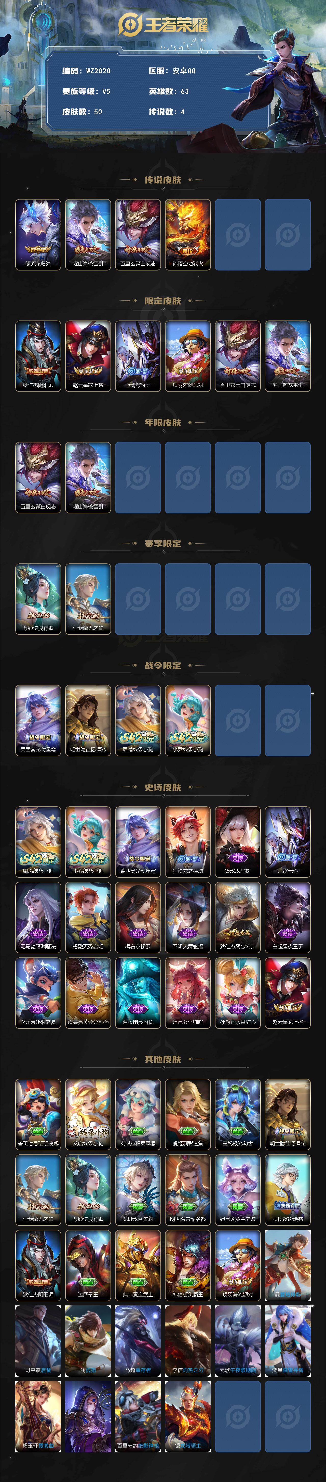 [17453698]安卓Q-50皮肤-4传说-17史诗 【传说皮肤】:澜逐花归海,曜山海苍雷引,百里玄策白虎志,孙悟空地狱火 【限定皮肤】:狄仁杰阴阳师,赵云皇家上将,元歌无心,项羽海滩派对,百里玄策白虎志,曜山海苍雷引 【年限皮肤】:百里玄策白虎志,曜山海苍雷引 【赛季限定】:甄姬逆浪荇歌,亚瑟荣光之誓 【战令限定】:莱西奥光弋星穹,明世隐往忆晖光,周瑜线条小狗,小乔线条小狗 【史诗皮肤】:周瑜线条小狗,小乔线条小狗,莱西奥光弋星穹,狂铁龙之律动,镜玫瑰异探,元歌无心,司马懿暗渊魔法,杨戬天秀启明,橘右京修罗,不知火舞魅语,狄仁杰鹰眼统帅,白起星夜王子,李元芳逐浪之夏,诸葛亮黄金分割率,曹操幽灵船长,妲己女仆咖啡,孙尚香水果甜心,赵云皇家上将 【其他皮肤】:鲁班七号班班快跑,桑启线条小狗,安琪拉糖果风暴,虞姬溯影追猎,蚩奼极光幻客,明世隐往忆晖光,亚瑟荣光之誓,甄姬逆浪荇歌,戈娅玫蓝誓约,明世隐景韶洛都,妲己紫罗兰之誓,张良缤纷绘卷,狄仁杰阴阳师,达摩拳王,典韦黄金武士,韩信街头霸王,项羽海滩派对,暃碧珀绯影,司空震启蛰,澜孤猎,马超幸存者,李信灼热之刃,元歌午夜歌剧院,弈星踏雪寻梅,杨玉环霓裳曲,明世隐占星师,百里守约绝影神枪,铠龙域领主 【营地ID】:1572429704