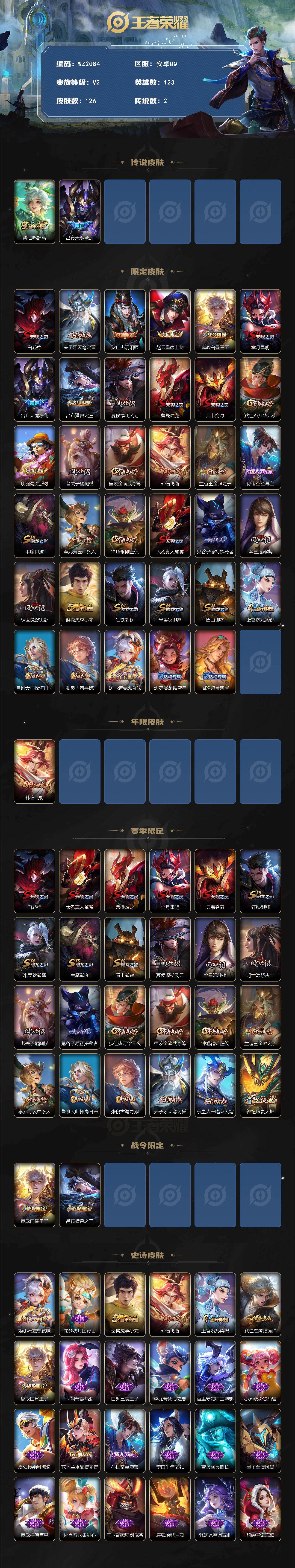 - [17302806]安卓WX-V0-至尊星耀III段位-126英雄-207皮肤-1典藏皮肤-11传说-63史诗 【荣耀典藏】:李白鸣剑曳影 【传说皮肤】:貂蝉曦玄引,虞姬无限倾心,曜山海苍雷引,李信山海炽霜斩,裴擒虎寅虎赤拳,镜炽阳神光,李信一念神魔,刘备时之恋人,梦奇胖达荣荣,孙尚香末日机甲,宫本武藏地狱之眼 【限定皮肤】:狄仁杰阴阳师,赵云皇家上将,赵云龙胆,墨子降魔,芈月白晶晶,吕布猎兽之王,元歌无心,夏侯惇匿光决锋者,狄仁杰魔术师,项羽海滩派对,老夫子航海奇遇记,孙悟空孙行者,李元芳云中旅人,虞姬无限倾心,太乙真人华丽摇滚,鬼谷子五谷丰年,梦奇顽趣,沈梦溪匿光破解者,裴擒虎寅虎赤拳,裴擒虎擒涛扼浪,云中君纤云弄巧,李信山海炽霜斩,上官婉儿梁祝,嫦娥拒霜思,曜山海苍雷引,鲁班大师探海日志,桑启海盐诗旅,艾琳流音漫舞,司空震地狱燃心,阿古朵江河有灵,张良古海寻踪,蒙犽百解令,高渐离燃音魔法,妲己灵卜魔法,鬼谷子天穹祈灯,伽罗琥珀纪元,姬小满妄想食味,貂蝉曦玄引,百里玄策超元猎域,鲁班七号蔬乡物语,李元芳蔬乡物语,刘邦剑破天穹,程咬金群星魔术团,镜青焰无极,项羽苍威无极 【年限皮肤】:裴擒虎寅虎赤拳,曜山海苍雷引,李信山海炽霜斩 【赛季限定】:李元芳云中旅人,桑启海盐诗旅,裴擒虎擒涛扼浪,鲁班大师探海日志,张良古海寻踪,鬼谷子天穹祈灯,刘邦剑破天穹,东皇太一噬灭天穹,太乙真人谧流熔炉,钟馗虚灵犬护,亚瑟荣光之誓,梦奇顽趣 【战令限定】:吕布猎兽之王,老夫子航海奇遇记,司空震地狱燃心,艾琳流音漫舞,高渐离燃音魔法,妲己灵卜魔法,鲁班七号蔬乡物语,李元芳蔬乡物语,镜青焰无极,项羽苍威无极,周瑜线条小狗 【史诗皮肤】:露娜紫霞仙子,阿轲暗夜猫娘,赵云皇家上将,赵云未来纪元,貂蝉圣诞恋歌,甄姬冰雪圆舞曲,狄仁杰魔术师,廉颇地狱岩魂,孙尚香水果甜心,嬴政摇滚巨星,妲己魅力维加斯,墨子金属风暴,吕布圣诞狂欢,曹操幽灵船长,李白千年之狐,吕布末日机甲,张飞乱世虎臣,花木兰水晶猎龙者,夏侯惇乘风破浪,兰陵王暗隐猎兽者,诸葛亮黄金分割率,安琪拉心灵骇客,百里守约特工魅影,蔡文姬舞动绿茵,李元芳逐浪之夏,白起星夜王子,阿轲节奏热浪,孙策猫狗日记,大乔猫狗日记,狄仁杰鹰眼统帅,公孙离无限星赏官,上官婉儿梁祝,娜可露露晚萤,橘右京修罗,赵云龙胆,孙尚香时之恋人,云中君纤云弄巧,芈月白晶晶,百里玄策热力回旋