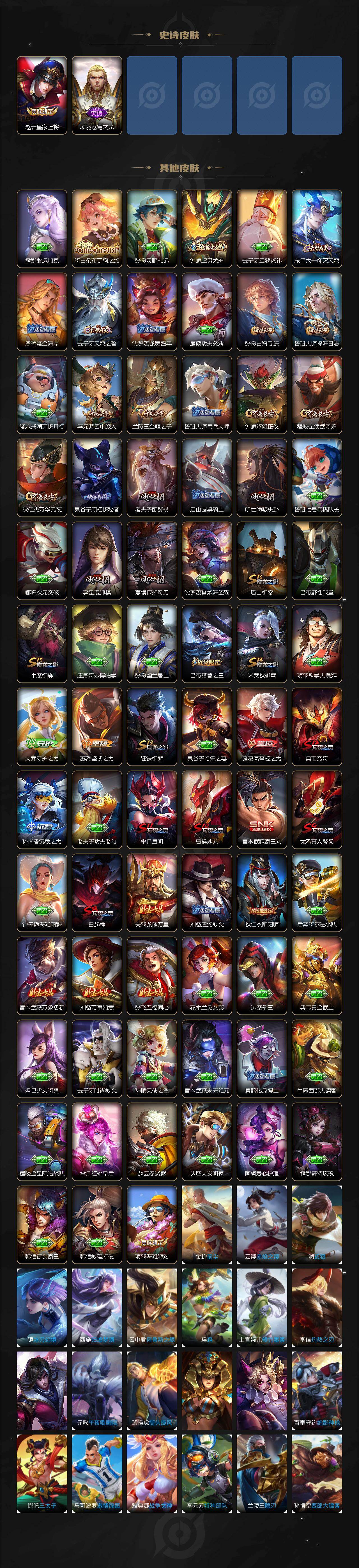 【史诗皮肤】:姬小满妄想食味,沈梦溪月团寄思,裴擒虎李小龙,韩信飞衡,上官婉儿梁祝,狄仁杰鹰眼统帅,嬴政白昼王子,阿轲节奏热浪,白起星夜王子,李元芳逐浪之夏,百里守约特工魅影,小乔缤纷独角兽,夏侯惇乘风破浪,花木兰水晶猎龙者,孙悟空至尊宝,李白千年之狐,曹操幽灵船长,墨子金属风暴,嬴政摇滚巨星,孙尚香水果甜心,宫本武藏鬼剑武藏,廉颇地狱岩魂,甄姬冰雪圆舞曲,貂蝉圣诞恋歌,赵云皇家上将,项羽苍穹之光