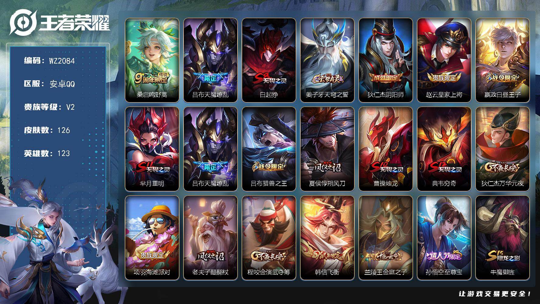 - [15156476]可二次【店主推荐捡漏号!可直接换绑】:安卓Q-V8-最强王者段位-126英雄-279皮肤-1典藏皮肤-19传说-68史诗 【英雄全皮】:孙权全皮,狂铁全皮,李信全皮,戈娅全皮 【荣耀典藏】:诸葛亮星域神启 【传说皮肤】:桑启鸣野蒿,诸葛亮鹤羽星尊,张飞百相守梦,曜山海苍雷引,李信山海炽霜斩,百里守约碎云,马超无双飞将,孙尚香异界灵契,虞姬启明星使,曜云鹰飞将,李信一念神魔,达摩黄金狮子座,百里玄策白虎志,杨戬永曜之星,李白凤求凰,孙尚香末日机甲,宫本武藏地狱之眼,孙悟空地狱火,狄仁杰超时空战士 【限定皮肤】:白起狰,姜子牙天穹之誓,狄仁杰阴阳师,赵云皇家上将,孙尚香异界灵契,鲁班七号狮舞东方,高渐离玩趣恶龙,阿轲迷踪丽影,钟无艳超时空战士,孙膑妖精王,扁鹊炼金王,扁鹊奇幻香踪,吕布猎兽之王,元歌无心,甄姬落雪兰心,曹操烛龙,典韦穷奇,典韦蓝屏警告,马可波罗山海玄木吟,狄仁杰魔术师,狄仁杰万华元夜,达摩沙漠行僧,项羽海滩派对,老夫子醍醐杖,关羽百相守梦,程咬金演武夺筹,刘邦夺宝奇兵,韩信飞衡,韩信傲雪梅枪,王昭君午后时光,兰陵王金庭之子,孙悟空至尊宝,孙悟空大圣娶亲,后羿辉光之辰,刘备百相守梦,张飞百相守梦,李元芳银河之约,李元芳云中旅人,虞姬启明星使,钟馗神迹守卫,钟馗驱傩正仪,杨玉环遇见飞天,杨戬永曜之星,杨戬潮玩骑兵,干将莫邪冰霜恋舞曲,干将莫邪胡桃夹子,雅典娜黎明之约,鬼谷子原初探秘者,鬼谷子五谷丰年,诸葛亮鹤羽星尊,铠青龙志,苏烈千军破阵,百里玄策白虎志,弈星混沌棋,沈梦溪星空之诺,沈梦溪大漠名商,沈梦溪匿光破解者,明世隐疑决卦,裴擒虎天狼狩猎者,裴擒虎擒涛扼浪,狂铁御狮,狂铁电玩高手,李信山海炽霜斩,盾山御銮,嫦娥暖冬兔眠,曜山海苍雷引,西施玲珑珍味,鲁班大师探海日志,桑启海盐诗旅,暃星界游侠,戈娅驭风魔法,阿古朵江河有灵,张良古海寻踪,鬼谷子天穹祈灯,沈梦溪龙舞盛年,刘邦剑破天穹,程咬金群星魔术团,周瑜熔金海岸 【年限皮肤】:百里玄策白虎志,铠青龙志,李白凤求凰,杨戬永曜之星,后羿辉光之辰,韩信飞衡,马可波罗山海玄木吟,李信山海炽霜斩,曜山海苍雷引 【赛季限定】:孙膑妖精王,扁鹊炼金王,白起狰,曹操烛龙,典韦穷奇,狄仁杰万华元夜,达摩沙漠行僧,老夫子醍醐杖,程咬金演武夺筹,兰陵王金庭之子,张良古海寻踪,李元芳云中旅人,钟馗驱傩正仪,雅典娜黎明之约,鬼谷