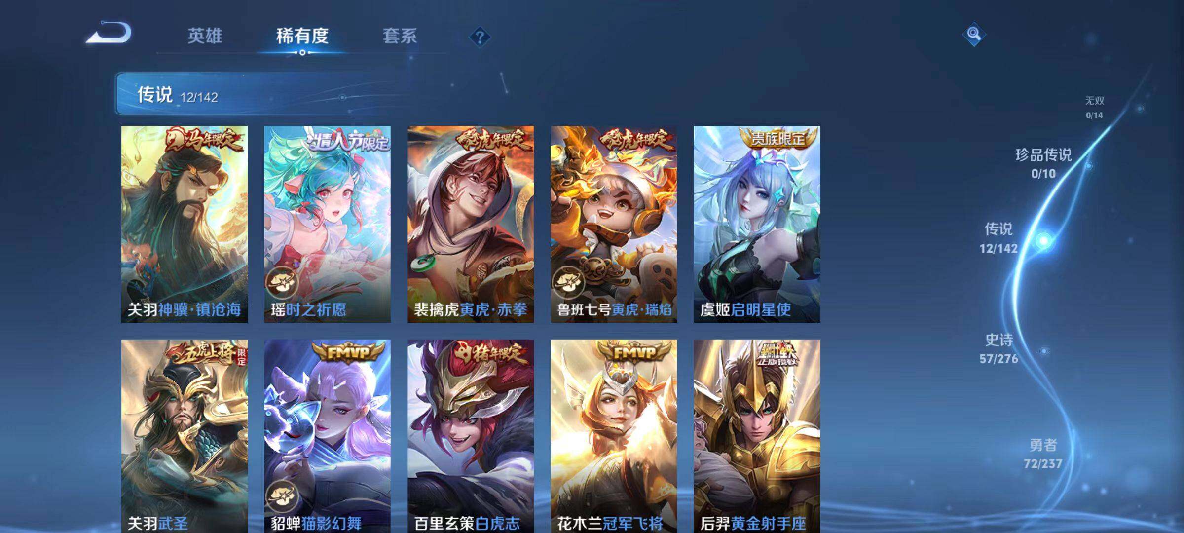 【传说皮肤】:关羽神骥镇沧海,瑶时之祈愿,裴擒虎寅虎赤拳,鲁班七号寅虎瑞焰,虞姬启明星使,关羽武圣,貂蝉猫影幻舞,百里玄策白虎志,花木兰冠军飞将,后羿黄金射手座,孙尚香末日机甲,吕布天魔缭乱