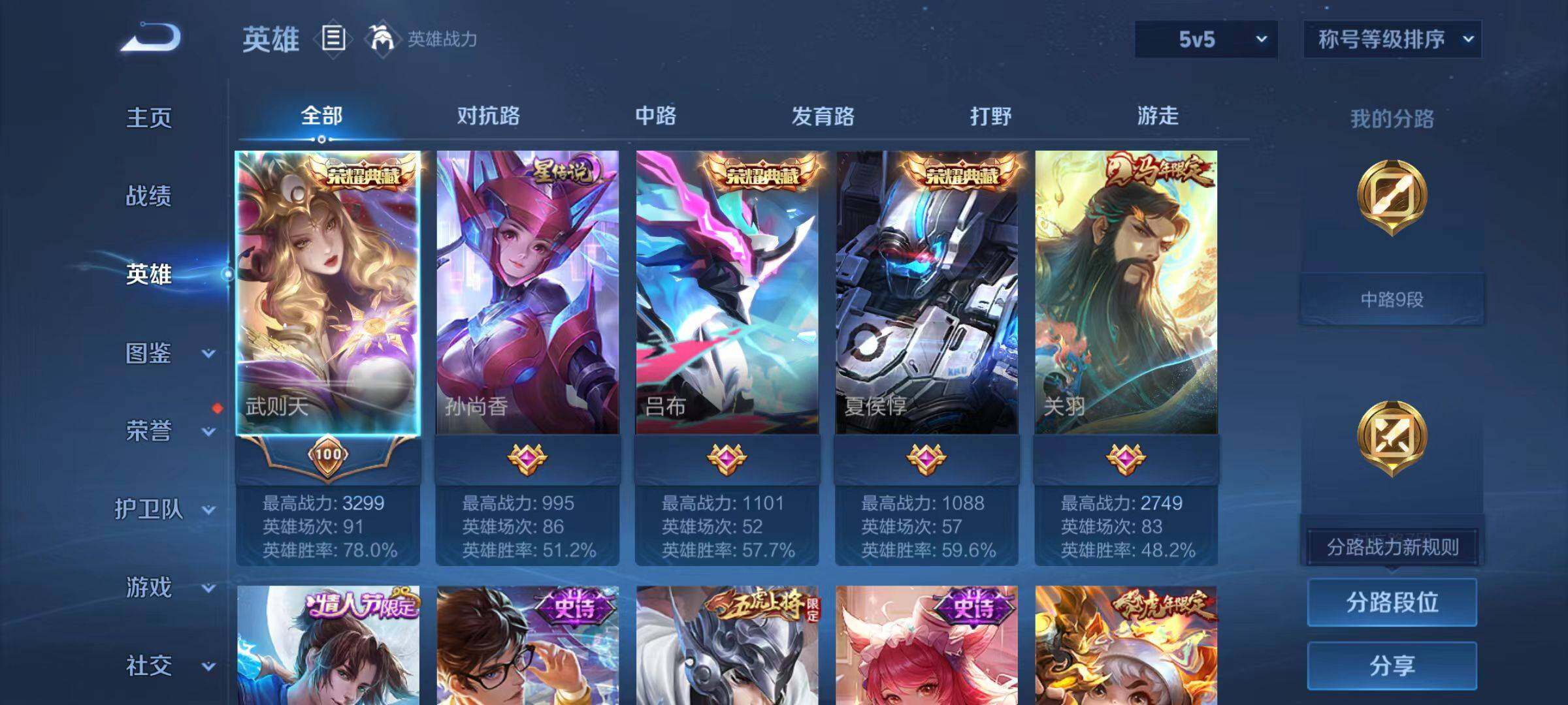 【赛季限定】:庄周蜃楼王,孙膑妖精王,扁鹊炼金王,虞姬凯尔特女王,芈月重明,典韦穷奇,狂铁御狮,米莱狄御霄,盾山御銮,明世隐疑决卦,鬼谷子原初探秘者,狄仁杰万华元夜,程咬金演武夺筹,钟馗驱傩正仪,达摩沙漠行僧,兰陵王金庭之子