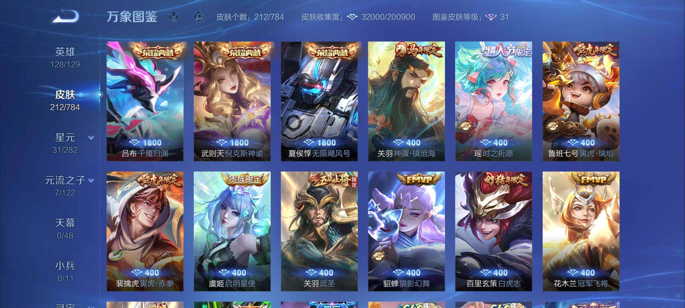 【限定皮肤】:狄仁杰阴阳师,虞姬凯尔特女王,廉颇寅虎御盾,赵云皇家上将,赵云龙胆,嬴政白昼王子,鲁班七号寅虎瑞焰,庄周蜃楼王,阿轲迷踪丽影,孙膑妖精王,孙膑寅虎展翼,扁鹊炼金王,芈月重明,芈月幻夜卜梦,吕布天魔缭乱,吕布猎兽之王,周瑜赤莲之焰,典韦穷奇,狄仁杰魔术师,狄仁杰万华元夜,达摩沙漠行僧,项羽海滩派对,关羽武圣,程咬金演武夺筹,刘邦夺宝奇兵,兰陵王金庭之子,孙悟空至尊宝,孙悟空大圣娶亲,李元芳银河之约,虞姬启明星使,钟馗驱傩正仪,杨玉环遇见飞天,杨玉环寅虎心曲,女娲朔望之晖,干将莫邪冰霜恋舞曲,雅典娜单词大作战,蔡文姬繁星吟游,东皇太一逐梦之光,鬼谷子原初探秘者,黄忠烈魂,黄忠火炮绅士,百里玄策白虎志,沈梦溪星空之诺,明世隐疑决卦,裴擒虎李小龙,裴擒虎寅虎赤拳,狂铁御狮,米莱狄御霄,瑶时之祈愿,云中君纤云弄巧,盾山御銮,上官婉儿梁祝,蒙犽狂想玩偶喵