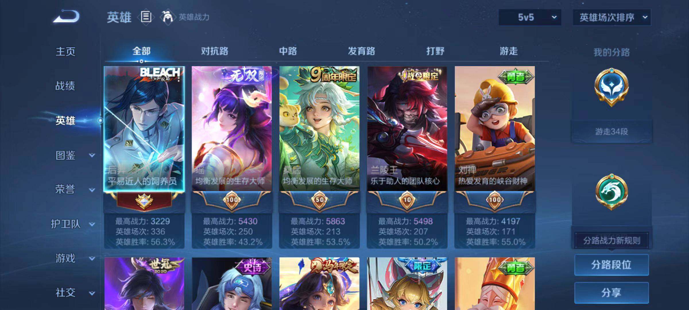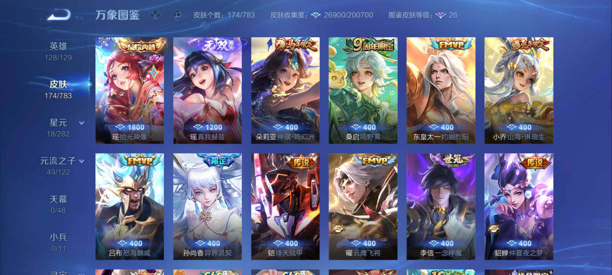 - PX_2083531-贵族等级: V8 英雄数: 122 皮肤数: 273 荣耀水晶: 星空梦想,鸣剑·曳影 星传说: 零号·雷霆,金色仲夏夜 传说皮: 黄金狮子座,黄金射手座,冠军飞将,猫影幻舞,炽阳神光,云霓雀翎,末日机甲-孙尚香,仲夏夜之梦,零号·赤焰,胖达荣荣,李逍遥,游龙清影,淬星耀世,末日机甲-孙策 限定皮: 冰锋战神,遇见飞天,李小龙,奔雷神使,祈雪灵祝,游园惊梦,梁祝,御风骁将,引