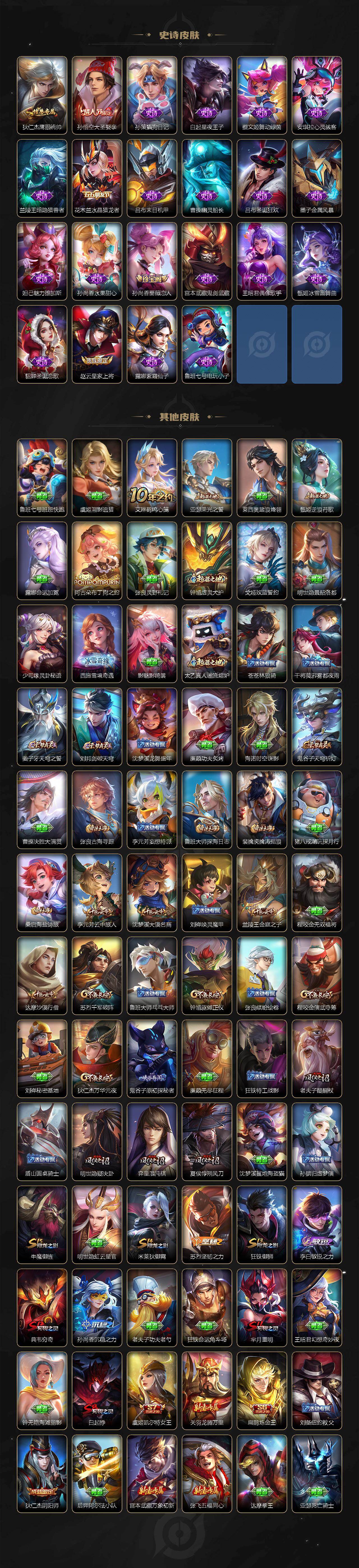 【史诗皮肤】:周瑜线条小狗,项羽九幽镇关,黄忠百相守梦,后羿石田雨龙,弈星万物之道,牛魔星界战将,米莱狄完美假期,元歌无心,鬼谷子五谷丰年,夏洛特永昼,裴擒虎李小龙,上官婉儿梁祝,狄仁杰鹰眼统帅,孙悟空大圣娶亲,孙策猫狗日记,白起星夜王子,蔡文姬舞动绿茵,安琪拉心灵骇客,兰陵王暗隐猎兽者,花木兰水晶猎龙者,吕布末日机甲,曹操幽灵船长,吕布圣诞狂欢,墨子金属风暴,妲己魅力维加斯,孙尚香水果甜心,孙尚香蔷薇恋人,宫本武藏鬼剑武藏,王昭君偶像歌手,甄姬冰雪圆舞曲,貂蝉圣诞恋歌,赵云皇家上将,露娜紫霞仙子,鲁班七号电玩小子