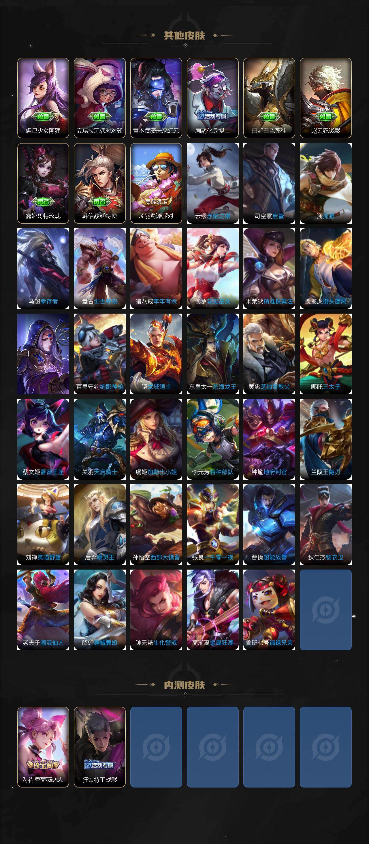 【限定皮肤】:白起狰,姜子牙天穹之誓,狄仁杰阴阳师,虞姬凯尔特女王,赵云皇家上将,孙尚香蔷薇恋人,扁鹊炼金王,芈月重明,元歌无心,夏侯惇朔风刀,典韦穷奇,狄仁杰万华元夜,达摩沙漠行僧,项羽海滩派对,老夫子醍醐杖,程咬金演武夺筹,兰陵王金庭之子,孙悟空大圣娶亲,牛魔御旌,李元芳云中旅人,钟馗驱傩正仪,鬼谷子原初探秘者,鬼谷子五谷丰年,苏烈千军破阵,弈星混沌棋,沈梦溪大漠名商,明世隐疑决卦,裴擒虎李小龙,裴擒虎擒涛扼浪,狂铁御狮,米莱狄御霄,上官婉儿梁祝,鲁班大师探海日志,桑启海盐诗旅,张良古海寻踪,鬼谷子天穹祈灯,沈梦溪龙舞盛年,刘邦剑破天穹