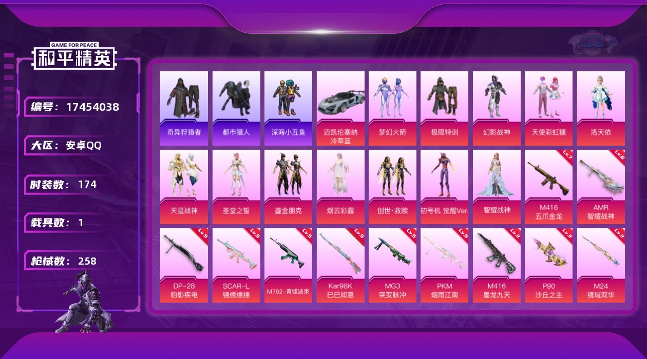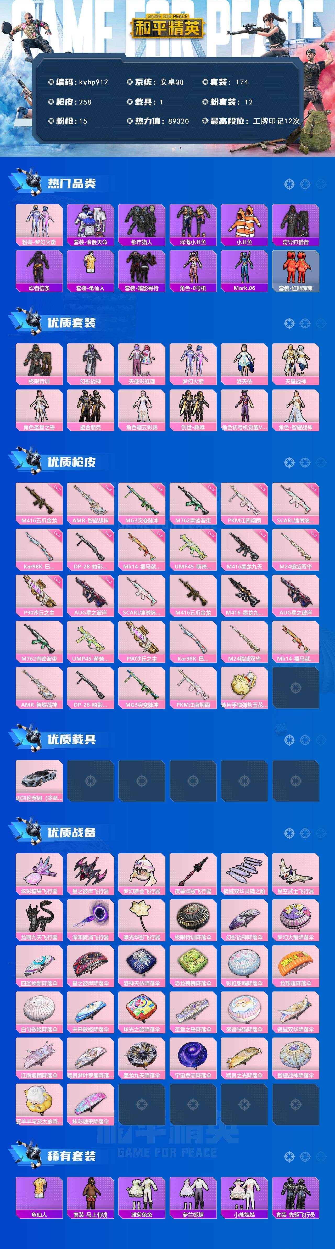 [17454038]安卓 手Q-12粉装-15特效枪-1载具-10粉色飞行器-89320热力值-12王牌印记-174套装-258枪皮