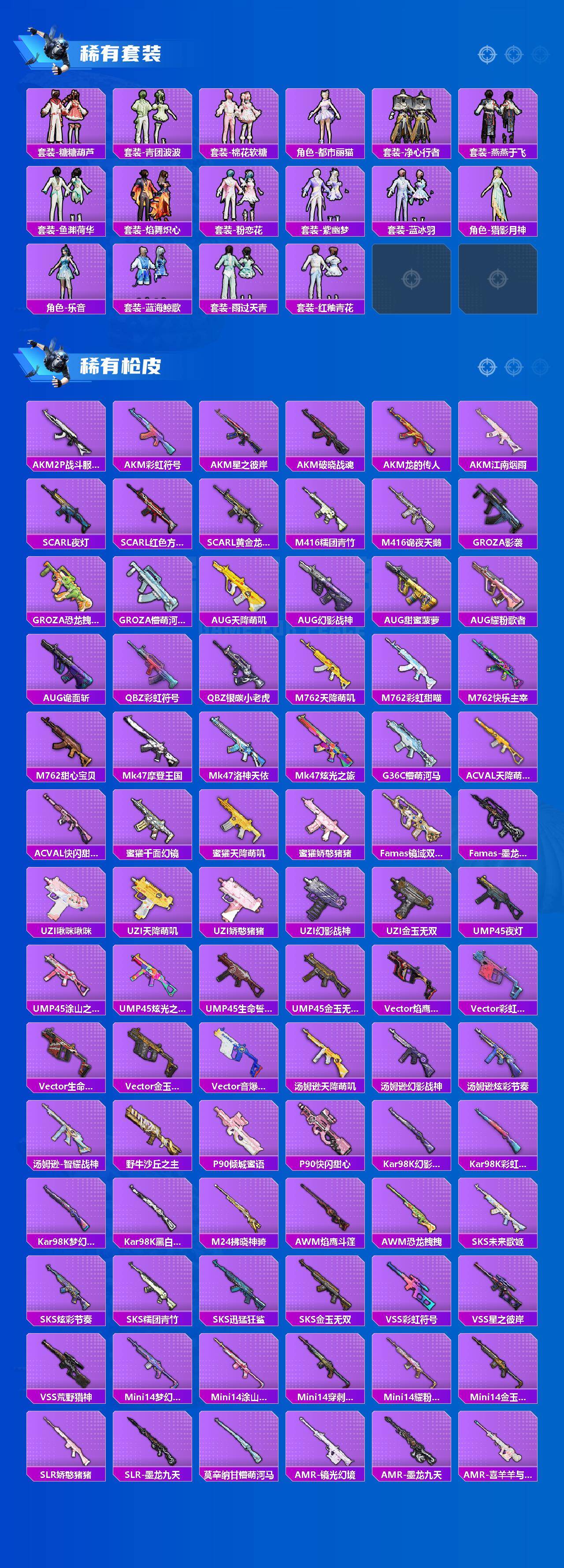 【粉色枪皮】:SCAR-L-锦绣绵绵,M416-五爪金龙,M416-墨龙九天,AUG-星之彼岸,M762-青锋波束,UMP45-萌骑冒险,P90-沙丘之主,Kar98K-巳巳如意,M24-镜域双华,Mk14-福马献瑞,AMR-智耀战神,DP-28-豹影疾电,MG3-突变脉冲,PKM-江南烟雨,破片手榴弹-秋玉花灯