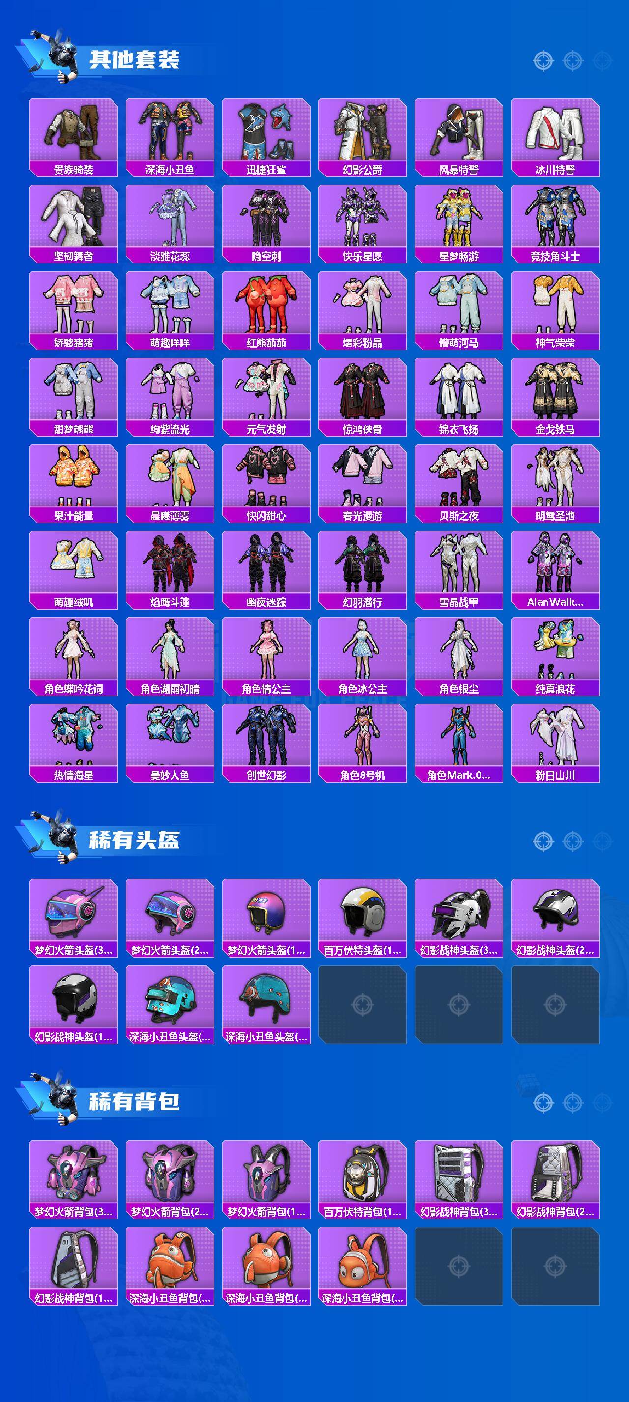 套装-梦幻火箭,套装-都市猎人,套装-深海小丑鱼,套装-奇异狩猎者,套装-极限特训,套装-幻影战神,套装-天使彩虹糖,角色-洛天依,套装-天星战神,角色-圣堂之誓,套装-鎏金朋克,角色-烟云彩露,套装-创世·救赎,角色-觉醒初号机,套装-鹰眼刺客,套装-迅捷狂鲨