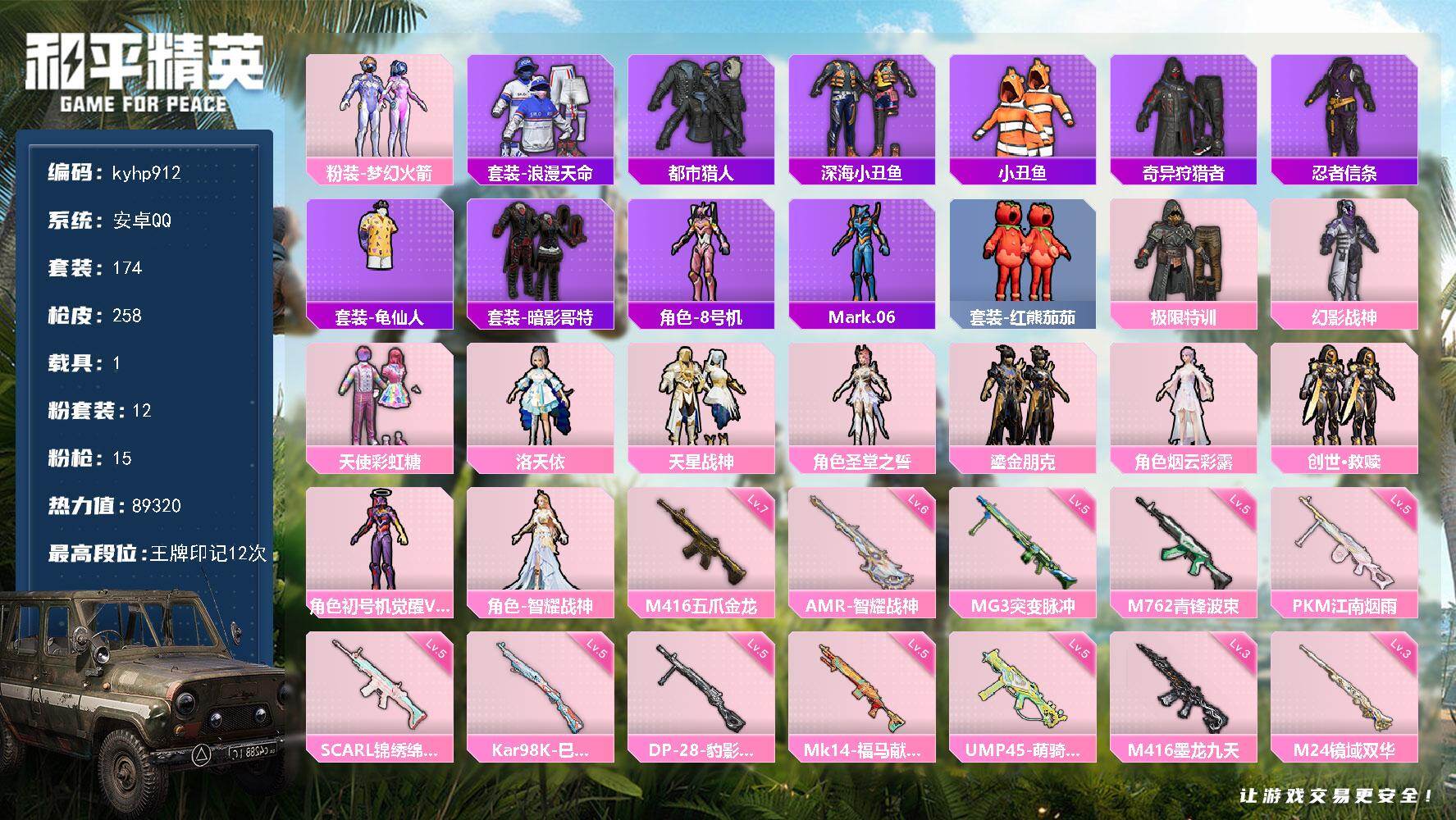 [17454038]安卓 手Q-12粉装-15特效枪-1载具-10粉色飞行器-89320热力值-12王牌印记-174套装-258枪皮 【热门品类】:粉装-梦幻火箭,套装-浪漫天命,套装-都市猎人,套装-深海小丑鱼,套装-小丑鱼,套装-奇异狩猎者,套装-忍者信条,套装-龟仙人,套装-暗影哥特,角色-8号机,角色-Mark.06,套装-红熊茄茄 【粉色套装】:粉装-极限特训,粉装-幻影战神,粉装-天使彩虹糖,粉装-梦幻火箭,角色-洛天依,粉装-天星战神,角色-圣堂之誓,粉装-鎏金朋克,角色-烟云彩露,套装-创世·救赎,角色-初号机 觉醒Ver.,角色-智耀战神 【粉色枪皮等级】:SCAR-L-锦绣绵绵(五级),M416-五爪金龙(七级),M416-墨龙九天(三级),AUG-星之彼岸(二级),M762-青锋波束(五级),UMP45-萌骑冒险(五级),P90-沙丘之主(三级),Kar98K-巳巳如意(五级),M24-镜域双华(三级),Mk14-福马献瑞(五级),AMR-智耀战神(六级),DP-28-豹影疾电(五级),MG3-突变脉冲(五级),PKM-江南烟雨(五级) 【粉色载具】:迈凯伦塞纳(冷萃蓝) 【粉色枪皮】:SCAR-L-锦绣绵绵,M416-五爪金龙,M416-墨龙九天,AUG-星之彼岸,M762-青锋波束,UMP45-萌骑冒险,P90-沙丘之主,Kar98K-巳巳如意,M24-镜域双华,Mk14-福马献瑞,AMR-智耀战神,DP-28-豹影疾电,MG3-突变脉冲,PKM-江南烟雨,破片手榴弹-秋玉花灯 【粉色飞行器】:炫彩糖果飞行器,星之彼岸飞行器,梦幻舞会飞行器,夜幕颂歌飞行器,镜域双华-灵镜之阶,星空武士飞行器,龙翔九天飞行器,深渊漩涡飞行器,曦光华影飞行器 【粉色降落伞】:极限特训降落伞,幻影战神降落伞,梦幻火箭降落伞,四圣焕新降落伞,星之彼岸降落伞,洛神天依降落伞,恐龙拽拽降落伞,彩虹甜喵降落伞,龙珠超降落伞,白勺歌姬降落伞,未来歌姬降落伞,炫光之旅降落伞,圣堂之誓降落伞,蜜语绒猫降落伞,镜域双华降落伞,江南烟雨降落伞,精灵梦叶罗丽降落伞,墨龙九天降落伞,宇宙意志降落伞,精灵之光降落伞,智耀战神降落伞,喜羊羊与灰太狼降落伞,炫彩糖果降落伞 【稀有套装】:套装-龟仙人,套装-炫彩糖果,套装-马上有钱,套装-雏菊兔兔,套装-萝兰蝴蝶,套装-小熊娃娃,套装-先驱飞行员,套装-糖糖