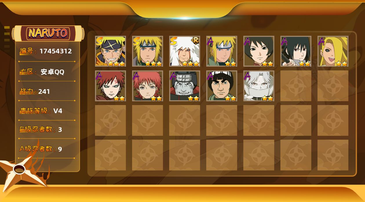 [17454312]3S级忍者数-9A级忍者数 【S级忍者】:自来也「舞之豪杰」(3星),波风水门(3星),漩涡鸣人·宇智波佐助(3星) 【A级忍者】:波风水门「青年」(2星),迪达拉「秽土转生」(2星),干柿鬼鲛(2星),迈特凯(2星),我爱罗「疾风传」(2星),蝎(2星),宇智波佐助「须佐能乎」(2星),卑留呼「火之意志继承者」(2星),黑土「博人传」(2星)