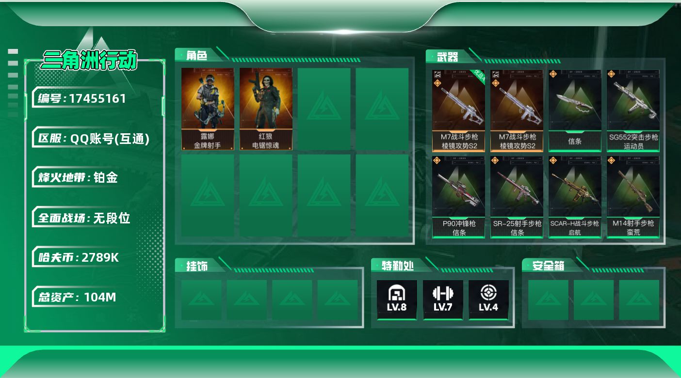 [17455161]【特价出售/店主推荐】104m总资产-2789k哈伏币-60烽火等级-铂金-1战场等级-无军衔 【干员外观】:红狼-电锯惊魂,露娜-金牌射手 【近战皮肤】:近战-信条,近战-黑鹰 【典藏外观】:M7战斗步枪-棱镜攻势S2 【典藏外观成色】:M7战斗步枪-棱镜攻势S2(优品A) 【传说外观】:SG552突击步枪-运动员,SCAR-H战斗步枪-启航,P90冲锋枪-信条,M14射手步枪-蛮荒,SR-25射手步枪-信条 【史诗外观】:KC17突击步枪-碎冰行动,K416突击步枪-冬日风情,M7战斗步枪-百步穿杨,SG552突击步枪-哈夫克警备,G3战斗步枪-流沙送葬,AS Val突击步枪-百步穿杨,MP5冲锋枪-战术竞备,Vector冲锋枪-百步穿杨,M249轻机枪-丛影谍踪,QJB201轻机枪-炽焰,SVD狙击步枪-阿萨拉工艺,M14射手步枪-工业狂潮, M14射手步枪-航天庆典,M700狙击步枪-百步穿杨,M700狙击步枪-哈夫克警备,AWM狙击步枪-流沙送葬 【稀有外观】:SR-3M紧凑突击步枪-巨兽,M14射手步枪-巨兽,M4A1突击步枪-繁盛,AKM突击步枪-肃杀,ASh-12战斗步枪-繁盛,K416突击步枪-一帆风顺,M7战斗步枪-捣蛋鬼,SG552突击步枪-2026,SG552突击步枪-马年新春,SG552突击步枪-贴花艺术,SCAR-H战斗步枪-荣耀列队,G3战斗步枪-主宰,G3战斗步枪-猛禽,CAR-15突击步枪-来财,腾龙突击步枪-冰天雪地,MK47突击步枪-冰河潜伏者,MP5冲锋枪-弄臣,P90冲锋枪-黄昏,P90冲锋枪-捣蛋鬼,UZI冲锋枪-亚特兰蒂斯,SMG-45冲锋枪-行动开启,SMG-45冲锋枪-幻影结构,SR-3M紧凑突击步枪-马年新春,勇士冲锋枪-前沿科技,勇士冲锋枪-主宰,勇士冲锋枪-冰天雪地,M249轻机枪-毛鲁斯之力,M249轻机枪-冰天雪地,Mini-14射手步枪-荣耀列队,SR-25射手步枪-开拓,PSG-1射手步枪-主宰,G18-前沿科技 【普通外观】:M16A4突击步枪-常青藤,S12K霰弹枪-监察,腾龙突击步枪-古铜*3,MP5冲锋枪-古铜,S12K霰弹枪-古铜*2,G17-古铜,VSS射手步枪-噬菌体,M4A1突击步枪-粉色涂装,M4A1突击步枪-高雅黑,M4A1突击步枪-海色,QBZ95-1突击步枪-高雅黑,QBZ95