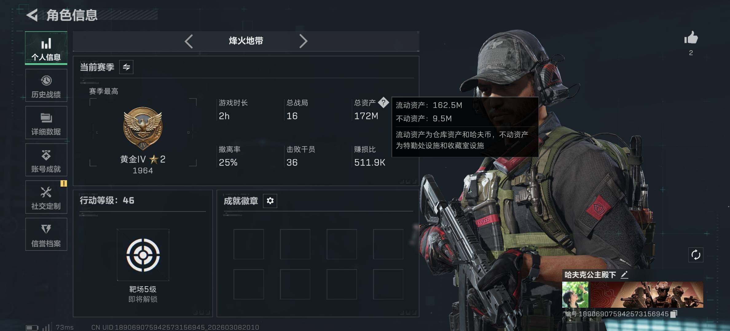 [17455272]173m总资产-130862k哈伏币-46烽火等级-黄金-23战场等级-上等兵