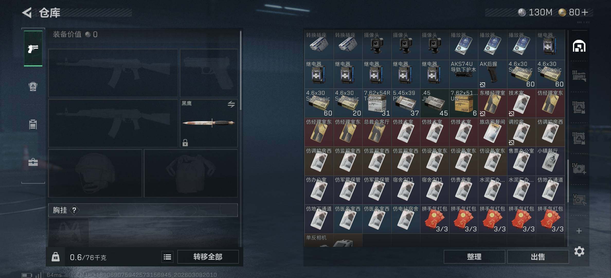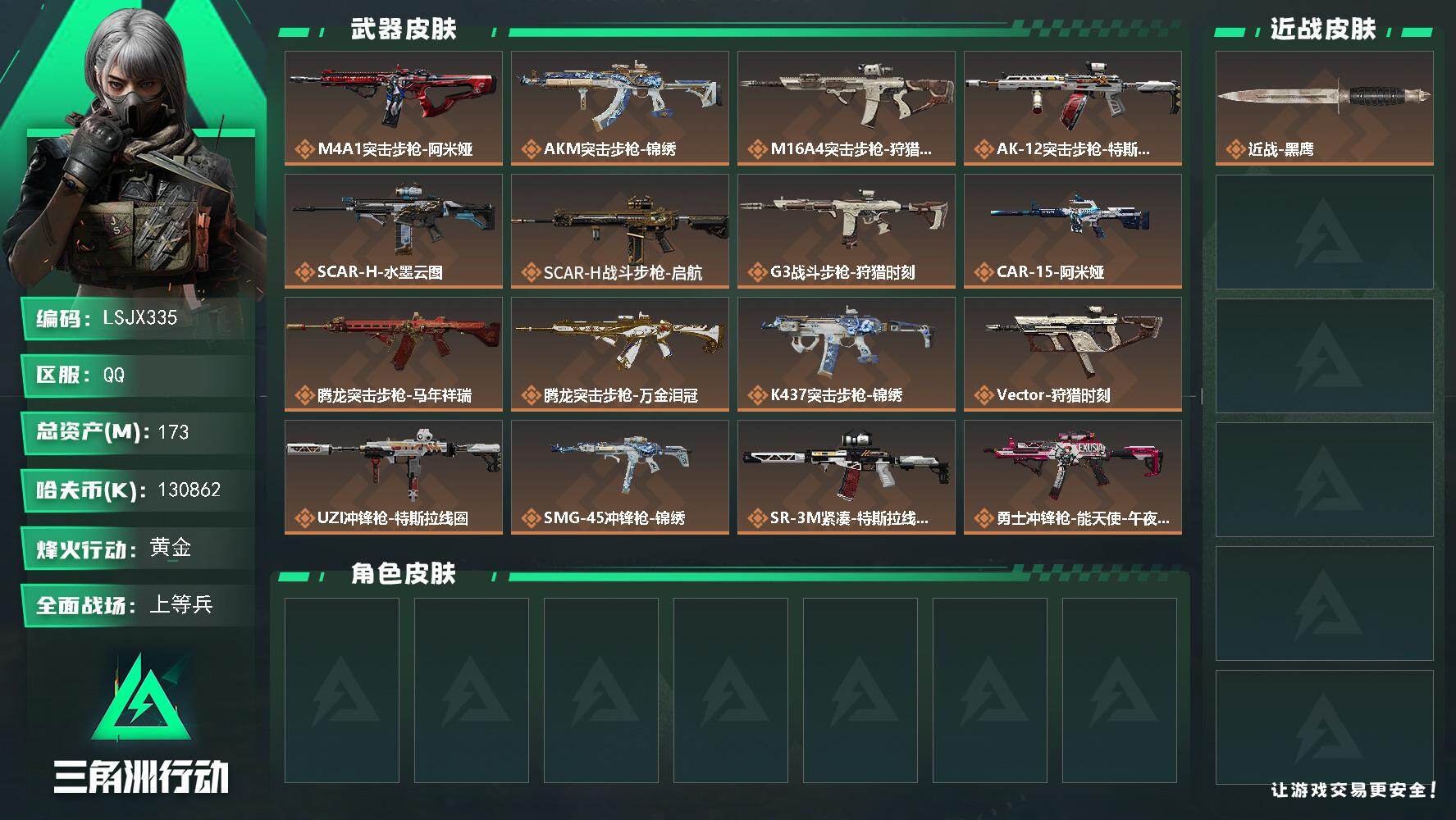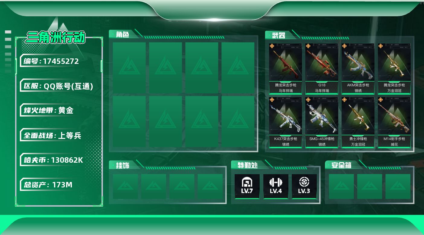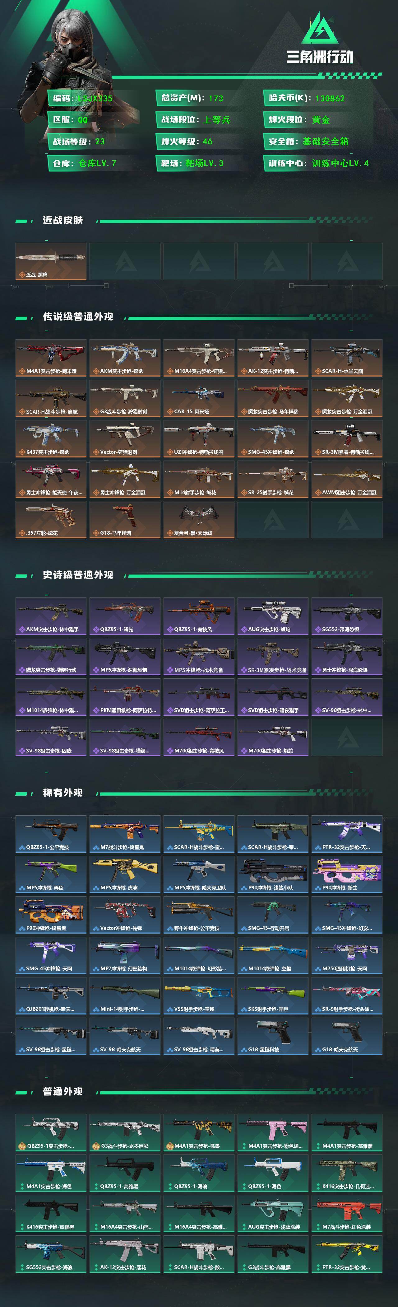 [17455272]173m总资产-130862k哈伏币-46烽火等级-黄金-23战场等级-上等兵 【近战皮肤】:近战-黑鹰 【传说外观】:M4A1突击步枪-阿米娅,AKM突击步枪-锦绣,M16A4突击步枪-狩猎时刻,AK-12突击步枪-特斯拉线圈,SCAR-H战斗步枪-水墨云图,SCAR-H战斗步枪-启航,G3战斗步枪-狩猎时刻,CAR-15突击步枪-阿米娅,腾龙突击步枪-马年祥瑞,腾龙突击步枪-万金泪冠,K437突击步枪-锦绣,Vector冲锋枪-狩猎时刻,UZI冲锋枪-特斯拉线圈,SMG-45冲锋枪-锦绣,SR-3M紧凑突击步枪-特斯拉线圈,勇士冲锋枪-能天使-午夜邮差,勇士冲锋枪-万金泪冠,M14射手步枪-缄花,SR-25射手步枪-缄花,AWM狙击步枪-万金泪冠,.357左轮-缄花,G18-马年祥瑞,复合弓-黑·天际线 【史诗外观】:AKM突击步枪-林中猎手,QBZ95-1突击步枪-曙光,AUG突击步枪-蝮蛇,SG552突击步枪-深海恐惧,腾龙突击步枪-猎鳄行动,MP5冲锋枪-深海恐惧,MP5冲锋枪-战术竞备,P90冲锋枪-紧急戒备,SR-3M紧凑突击步枪-战术竞备,勇士冲锋枪-深海恐惧,M1014霰弹枪-林中猎手,PKM通用机枪-阿萨拉特攻,SVD狙击步枪-阿萨拉工艺,SVD狙击步枪-暗夜猎手,SV-98狙击步枪-林中猎手,SV-98狙击步枪-囚徒,SV-98狙击步枪-猎鳄行动,M700狙击步枪-竞技风,M700狙击步枪-蝮蛇 【稀有外观】:QBZ95-1突击步枪-公平竞技,M7战斗步枪-捣蛋鬼,SCAR-H战斗步枪-童趣,SCAR-H战斗步枪-荣耀列队,PTR-32突击步枪-天网,MP5冲锋枪-弄臣,MP5冲锋枪-虎啸,MP5冲锋枪-哈夫克卫队,P90冲锋枪-浅鲨小队,P90冲锋枪-新生,P90冲锋枪-捣蛋鬼,Vector冲锋枪-先锋,野牛冲锋枪-公平竞技,SMG-45冲锋枪-行动开启,SMG-45冲锋枪-幻影结构,SMG-45冲锋枪-天网,MP7冲锋枪-幻影结构,M1014霰弹枪-幻影结构,M1014霰弹枪-童趣,M250通用机枪-天网,QJB201轻机枪-哈夫克卫队,Mini-14射手步枪-荣耀列队,VSS射手步枪-童趣,SKS射手步枪-弄臣,SR-9射手步枪-街头涂鸦,SV-98狙击步枪-星链科技,SV-98狙击步枪-哈夫克航天,SV-98狙击步枪-精英联盟,QSZ