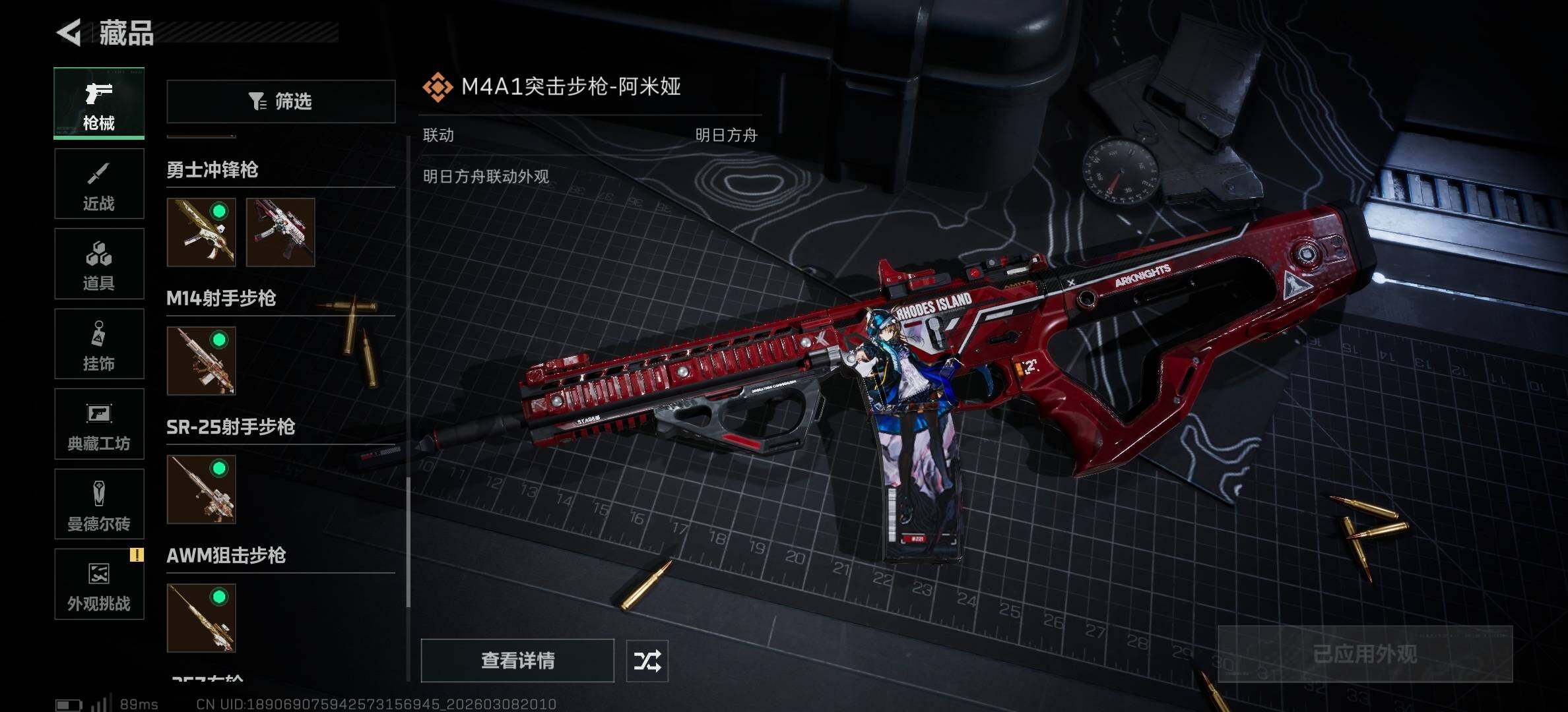 【传说外观】:M4A1突击步枪-阿米娅,AKM突击步枪-锦绣,M16A4突击步枪-狩猎时刻,AK-12突击步枪-特斯拉线圈,SCAR-H战斗步枪-水墨云图,SCAR-H战斗步枪-启航,G3战斗步枪-狩猎时刻,CAR-15突击步枪-阿米娅,腾龙突击步枪-马年祥瑞,腾龙突击步枪-万金泪冠,K437突击步枪-锦绣,Vector冲锋枪-狩猎时刻,UZI冲锋枪-特斯拉线圈,SMG-45冲锋枪-锦绣,SR-3M紧凑突击步枪-特斯拉线圈,勇士冲锋枪-能天使-午夜邮差,勇士冲锋枪-万金泪冠,M14射手步枪-缄花,SR-25射手步枪-缄花,AWM狙击步枪-万金泪冠,.357左轮-缄花,G18-马年祥瑞,复合弓-黑·天际线