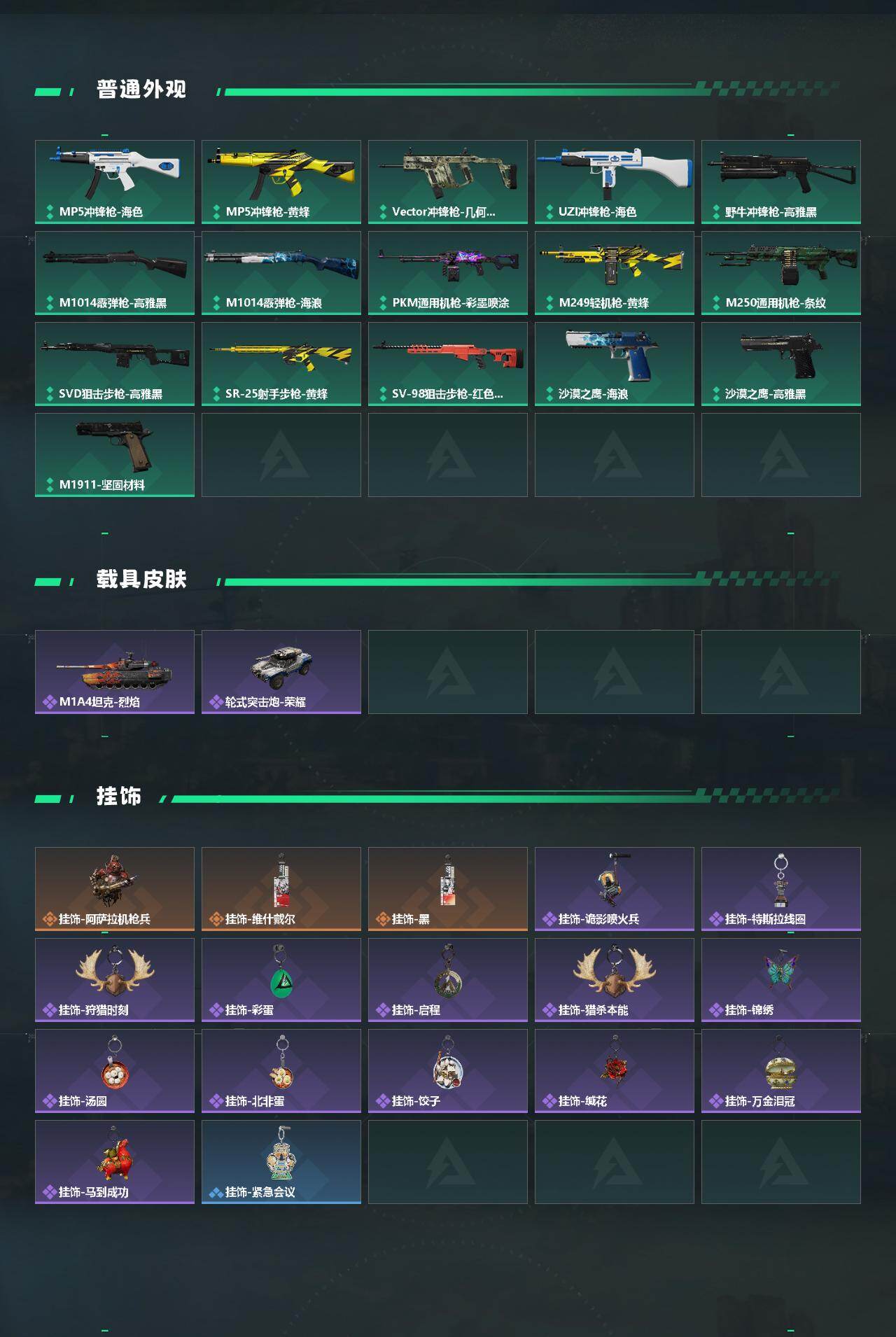 【史诗外观】:AKM突击步枪-林中猎手,QBZ95-1突击步枪-曙光,AUG突击步枪-蝮蛇,SG552突击步枪-深海恐惧,腾龙突击步枪-猎鳄行动,MP5冲锋枪-深海恐惧,MP5冲锋枪-战术竞备,P90冲锋枪-紧急戒备,SR-3M紧凑突击步枪-战术竞备,勇士冲锋枪-深海恐惧,M1014霰弹枪-林中猎手,PKM通用机枪-阿萨拉特攻,SVD狙击步枪-阿萨拉工艺,SVD狙击步枪-暗夜猎手,SV-98狙击步枪-林中猎手,SV-98狙击步枪-囚徒,SV-98狙击步枪-猎鳄行动,M700狙击步枪-竞技风,M700狙击步枪-蝮蛇