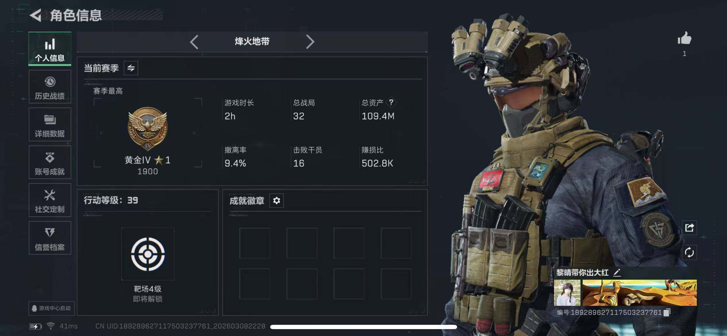 [17455260]【特价出售/店主推荐】109m总资产-80470k哈伏币-39烽火等级-黄金-23战场等级-上等兵