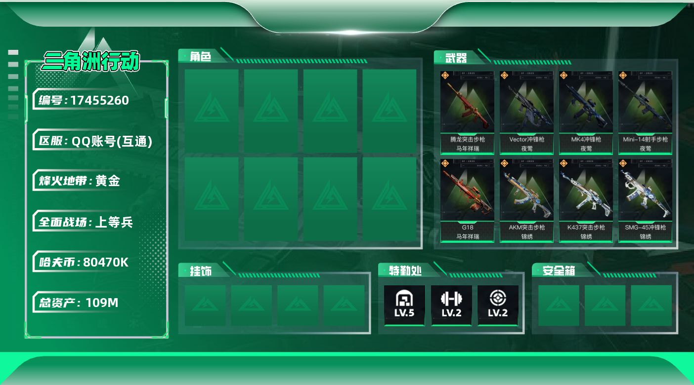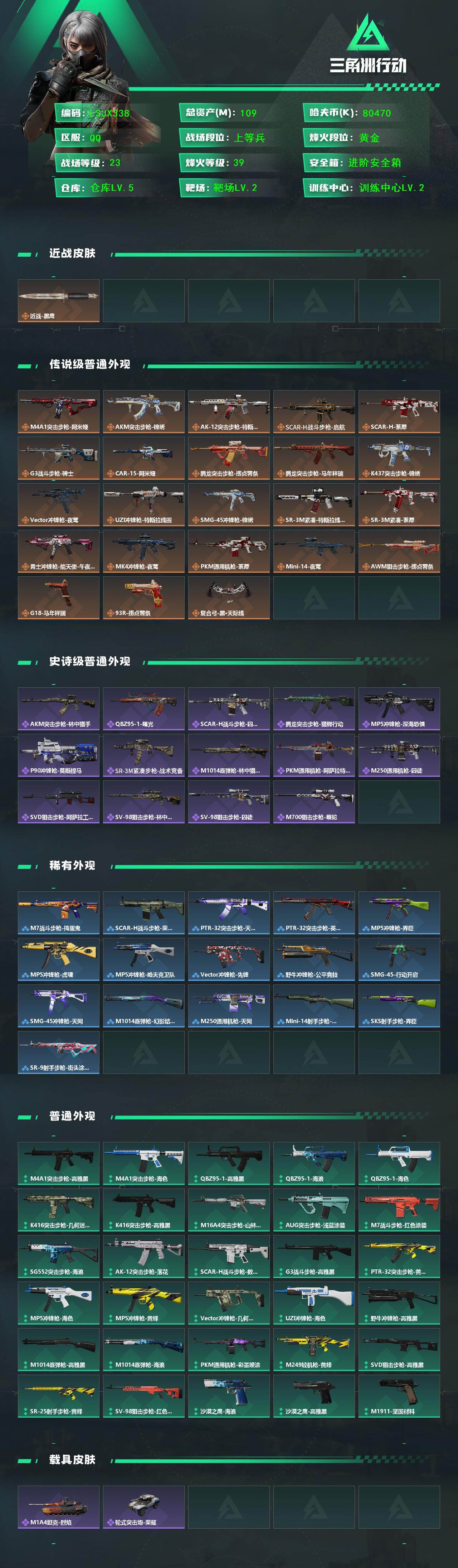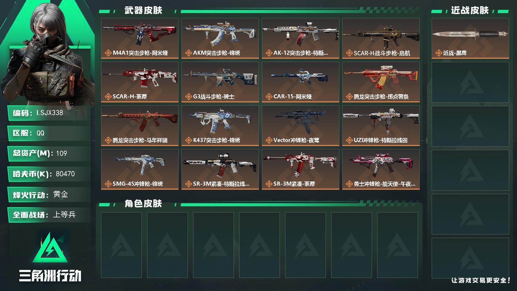 [17455260]【特价出售/店主推荐】109m总资产-80470k哈伏币-39烽火等级-黄金-23战场等级-上等兵 【近战皮肤】:近战-黑鹰 【传说外观】:M4A1突击步枪-阿米娅,AKM突击步枪-锦绣,AK-12突击步枪-特斯拉线圈,SCAR-H战斗步枪-启航,SCAR-H战斗步枪-荼蘼,G3战斗步枪-骑士,CAR-15突击步枪-阿米娅,腾龙突击步枪-捞点薯条,腾龙突击步枪-马年祥瑞,K437突击步枪-锦绣,Vector冲锋枪-夜莺,UZI冲锋枪-特斯拉线圈,SMG-45冲锋枪-锦绣,SR-3M紧凑突击步枪-特斯拉线圈,SR-3M紧凑突击步枪-荼蘼,勇士冲锋枪-能天使-午夜邮差,MK4冲锋枪-夜莺,PKM通用机枪-荼蘼,Mini-14射手步枪-夜莺,AWM狙击步枪-捞点薯条,G18-马年祥瑞,93R-捞点薯条,复合弓-黑·天际线 【史诗外观】:AKM突击步枪-林中猎手,QBZ95-1突击步枪-曙光,SCAR-H战斗步枪-囚徒,腾龙突击步枪-猎鳄行动,MP5冲锋枪-深海恐惧,P90冲锋枪-莫斯提马,P90冲锋枪-紧急戒备,SR-3M紧凑突击步枪-战术竞备,M1014霰弹枪-林中猎手,PKM通用机枪-阿萨拉特攻,M250通用机枪-囚徒,SVD狙击步枪-阿萨拉工艺,SV-98狙击步枪-林中猎手,SV-98狙击步枪-囚徒,M700狙击步枪-蝮蛇 【稀有外观】:M7战斗步枪-捣蛋鬼,SCAR-H战斗步枪-荣耀列队,SCAR-H战斗步枪-开心时刻,PTR-32突击步枪-天网,PTR-32突击步枪-英雄,MP5冲锋枪-弄臣,MP5冲锋枪-虎啸,MP5冲锋枪-哈夫克卫队,Vector冲锋枪-先锋,野牛冲锋枪-公平竞技,SMG-45冲锋枪-行动开启,SMG-45冲锋枪-天网,M1014霰弹枪-幻影结构,M250通用机枪-天网,Mini-14射手步枪-荣耀列队,SKS射手步枪-弄臣,SR-9射手步枪-街头涂鸦,QSZ92G-一帆风顺 【普通外观】:M4A1突击步枪-高雅黑,M4A1突击步枪-海色,QBZ95-1突击步枪-高雅黑,QBZ95-1突击步枪-海浪,QBZ95-1突击步枪-海色,K416突击步枪-几何迷彩,K416突击步枪-高雅黑,M16A4突击步枪-山林猎人,AUG突击步枪-浅蓝涂装,M7战斗步枪-红色涂装,SG552突击步枪-海浪,SG552突击步枪-狂欢,AK-12突击步枪-落花,S
