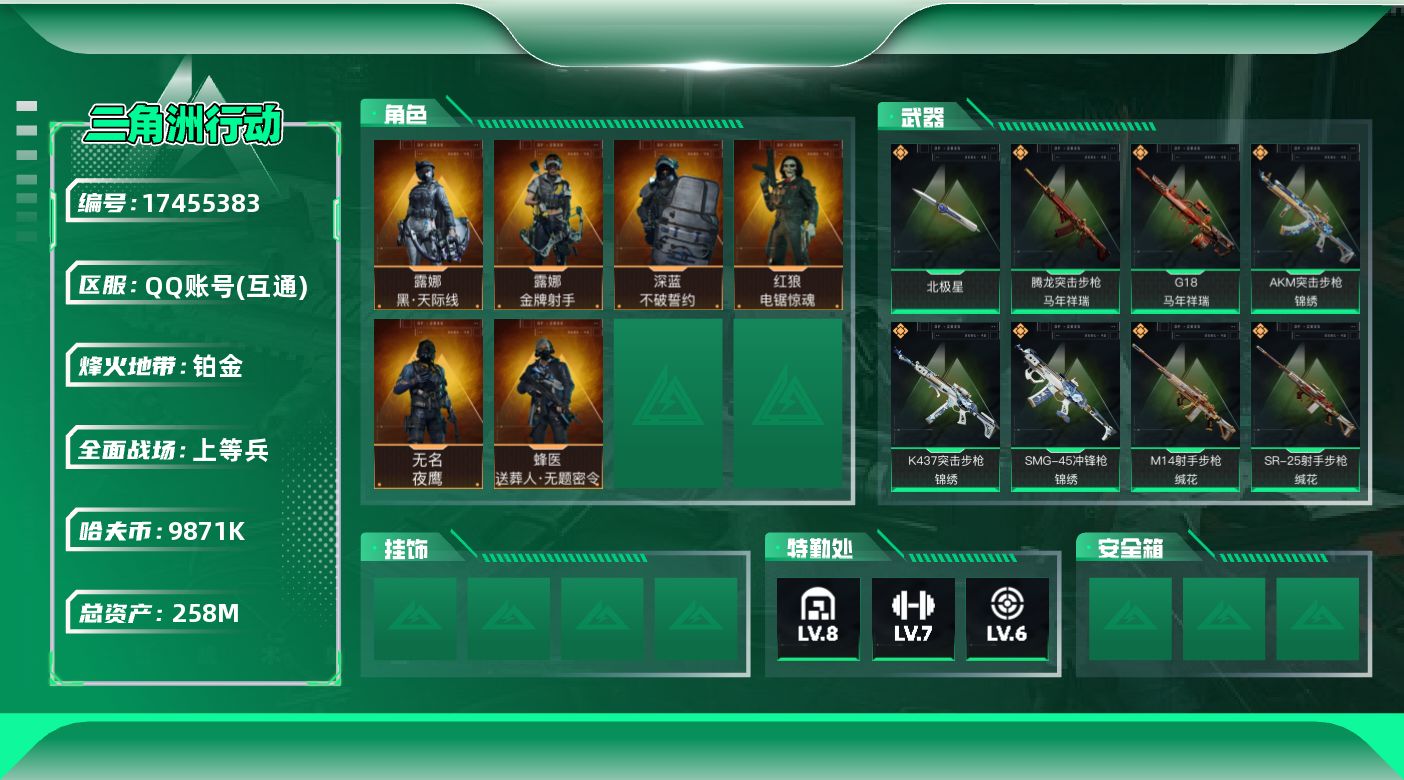 [17455383]可二次【特价出售/店主推荐】258m总资产-9871k哈伏币-60烽火等级-铂金-50战场等级-上等兵 【干员外观】:露娜-黑·天际线,蜂医-送葬人·无题密令,无名-夜鹰,深蓝-不破誓约,红狼-电锯惊魂,露娜-金牌射手 【近战皮肤】:近战-北极星,近战-黑鹰 【传说外观】:M4A1突击步枪-阿米娅,AKM突击步枪-锦绣,ASh-12战斗步枪-鹅鸭杀,SG552突击步枪-运动员,AK-12突击步枪-夜鹰,AK-12突击步枪-特斯拉线圈,SCAR-H战斗步枪-启航,G3战斗步枪-骑士,CAR-15突击步枪-阿米娅,AS Val突击步枪-死神玫瑰,腾龙突击步枪-捞点薯条,腾龙突击步枪-死神玫瑰,腾龙突击步枪-马年祥瑞,K437突击步枪-北极星,K437突击步枪-几何解构,K437突击步枪-锦绣,KC17突击步枪-电锯惊魂,UZI冲锋枪-特斯拉线圈,SMG-45冲锋枪-锦绣,SR-3M紧凑突击步枪-特斯拉线圈,SR-3M紧凑突击步枪-暗星,勇士冲锋枪-能天使-午夜邮差,QCQ171冲锋枪-北极星,QCQ171冲锋枪-鹅鸭杀,S12K霰弹枪-死神玫瑰,725双管霰弹枪-送葬人-无题密令,M250通用机枪-几何解构,M250通用机枪-骑士之心,QJB201轻机枪-鹅鸭杀,M14射手步枪-蛮荒,M14射手步枪-缄花,SKS射手步枪-骑士,SR-25射手步枪-水墨云图,SR-25射手步枪-缄花,SR-9射手步枪-几何解构,AWM狙击步枪-捞点薯条,.357左轮-缄花,G18-马年祥瑞,93R-捞点薯条,复合弓-黑·天际线 【史诗外观】:PSG-1射手步枪-原型机,PTR-32突击步枪-碎冰行动,M4A1突击步枪-战术竞备,AKM突击步枪-林中猎手,QBZ95-1突击步枪-曙光,ASh-12战斗步枪-守夜人,ASh-12战斗步枪-无极限,K416突击步枪-冬日风情,K416突击步枪-腊梅,K416突击步枪-阿萨拉特攻,K416突击步枪-缄默情歌,M16A4突击步枪-竞赛选手,AUG突击步枪-蝮蛇,M7战斗步枪-百步穿杨,SG552突击步枪-尖端治疗,SG552突击步枪-深海恐惧,SG552突击步枪-哈夫克警备,SCAR-H战斗步枪-囚徒,G3战斗步枪-流沙送葬,G3战斗步枪-哈夫克警备,AS Val突击步枪-尖端治疗,AS Val突击步枪-典狱官,AS Val突击步枪-百步穿杨,腾