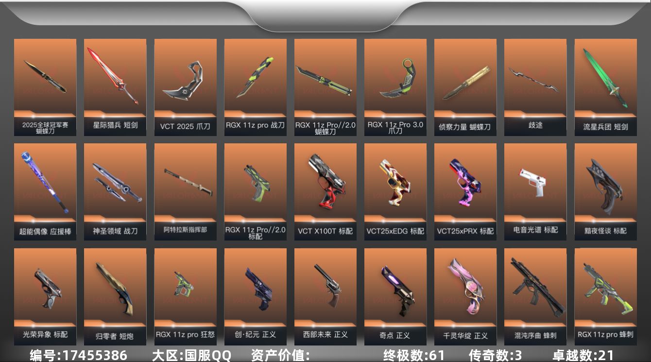 [17455386]【店主推荐捡漏号!可直接换绑】【套装】:2025全球冠军赛套装,光荣异象套装,RGX 11z Pro套装,VCT 2025 赛季套装,RGX 11z Pro//2.0套装,创·纪元套装,离火刃套装,归零者套装,神中神罚套装,离火刃套装 【英雄】:幻棱,炼狱,维斯,暮蝶,钛狐,壹决,铁臂,捷风,雷兹,幽影,不死鸟,贤者,猎枭,蝰蛇,零,芮娜,奇乐,尚勃勒,霓虹,斯凯,夜露,星礈,K/O,海神,盖可,黑梦,钢锁 【近战 武器】:近战武器-2025全球冠军赛 蝴蝶刀,近战武器-影钩,近战武器-光荣异象 歧途,近战武器-RGX 11z Pro 战刀,近战武器-神之刃,近战武器-RGX 11z Pro//2.0 蝴蝶刀,近战武器-侦察力量 蝴蝶刀,近战武器-剥皮小刀,近战武器-VCT 2025 爪刀,近战武器-紫金爪刀,近战武器-RGX 11z Pro//3.0 爪刀,近战武器-离火刃,近战武器-落英飞旋,近战武器-镭切,近战武器-鬼丸国纲,近战武器-流星兵团 短剑,近战武器-超能偶像 应援棒,近战武器-生物收割器,近战武器-神圣领域 战刀,近战武器-阿特拉斯指挥部 甩棍,近战武器-星际猎兵 短剑 【狂徒】:狂徒-艾沃莉的梦之翼,狂徒-2025全球冠军赛,狂徒-2023全球冠军赛,狂徒-归零者,狂徒-混沌序曲,狂徒-塑水宗,狂徒-创·纪元,狂徒-RGX 11z Pro,狂徒-光荣异象,狂徒-堕天遗武,狂徒-掠影,狂徒-盖亚的复仇,狂徒-海洋之星,狂徒-紫阙金琅,狂徒-超能偶像,狂徒-钢轨卫士,狂徒-弧光异彩,狂徒-流星兵团,狂徒-沙尘幻旅,狂徒-诡秘蛇影 【幻影】:幻影-源能者娱乐系统,幻影-洪荒怒焰,幻影-砰砰X特攻队,幻影-RGX 11z Pro//2.0,幻影-末日泡泡,幻影-天界神兵//2.0,幻影-神中神罚,幻影-超限闪存,幻影-合金战车,幻影-神圣领域,幻影-聚合之力,幻影-战术小伙伴 【戍卫】:戍卫-破败军械,戍卫-RGX 11z Pro,戍卫-天界神兵,戍卫-超能偶像,戍卫-钢轨卫士,戍卫-彩梦之城,戍卫-浮光跃金,戍卫-花漾粉红,戍卫-萌彩剪影,戍卫-战术熊与伙伴们,戍卫-月球哨兵,戍卫-折光棱晶 【獠犬】:獠犬-归零者,獠犬-弧光异彩,獠犬-神圣领域,獠犬-采蜜小蜂队,獠犬-胡桃狂想,獠犬-模拟赫兹,獠犬-数码咒术,獠犬-战术小伙伴 【冥驹】:冥驹-归零