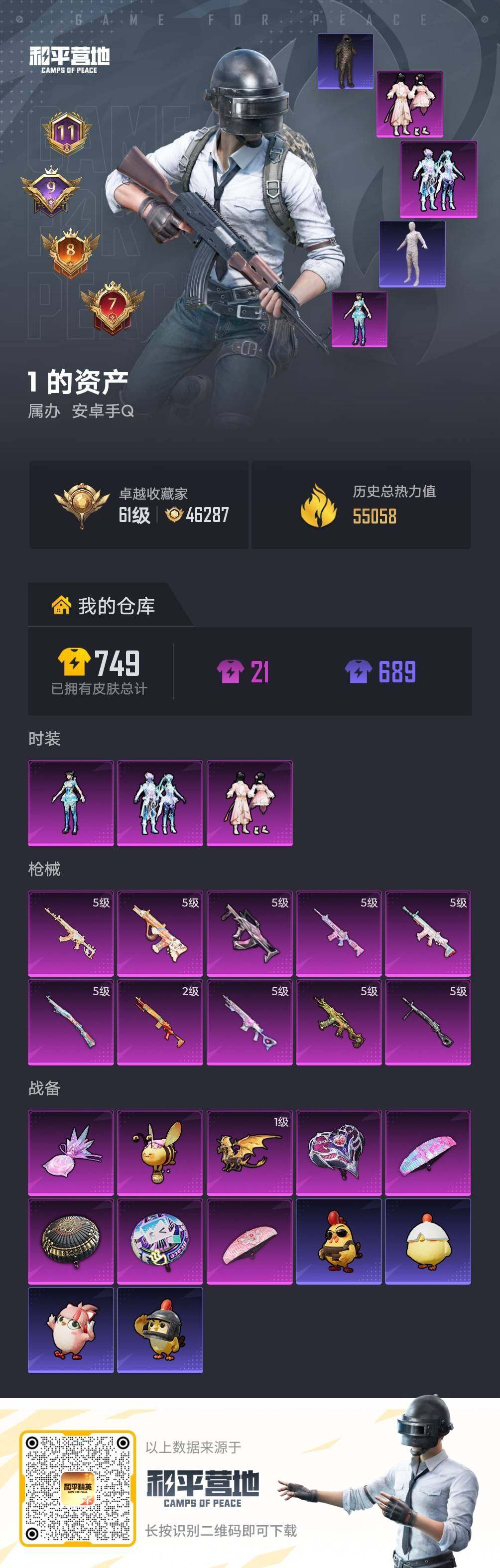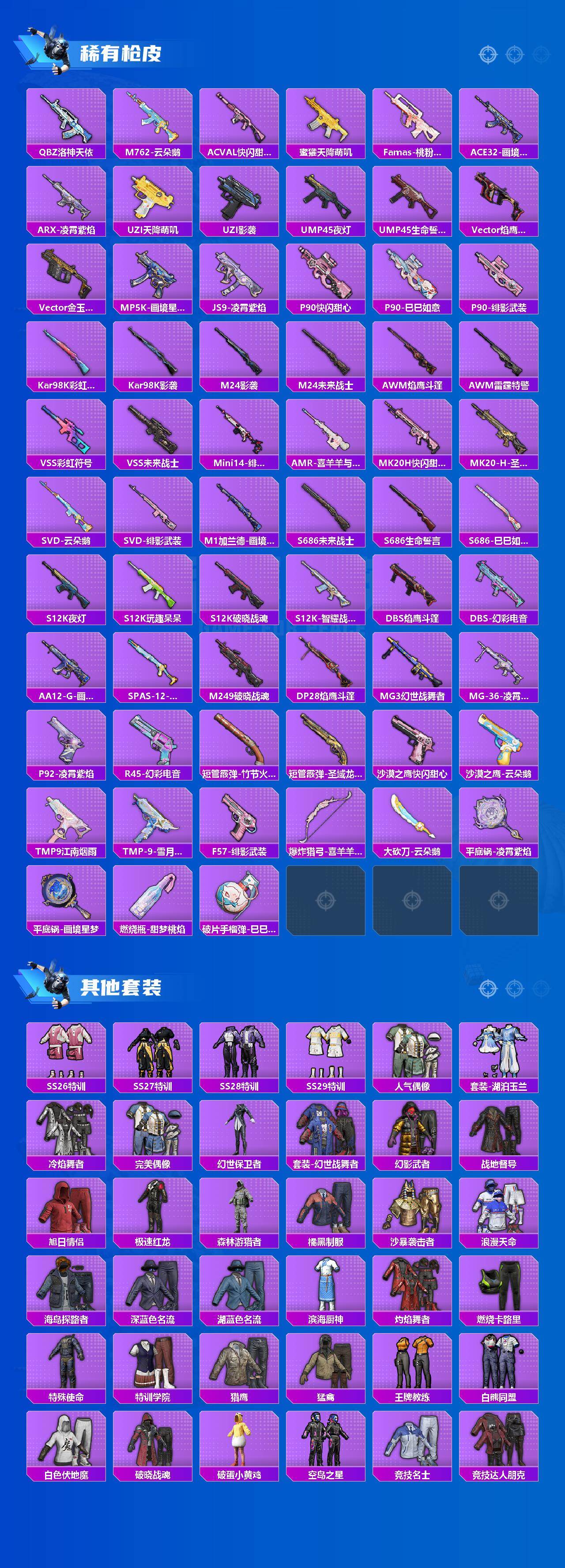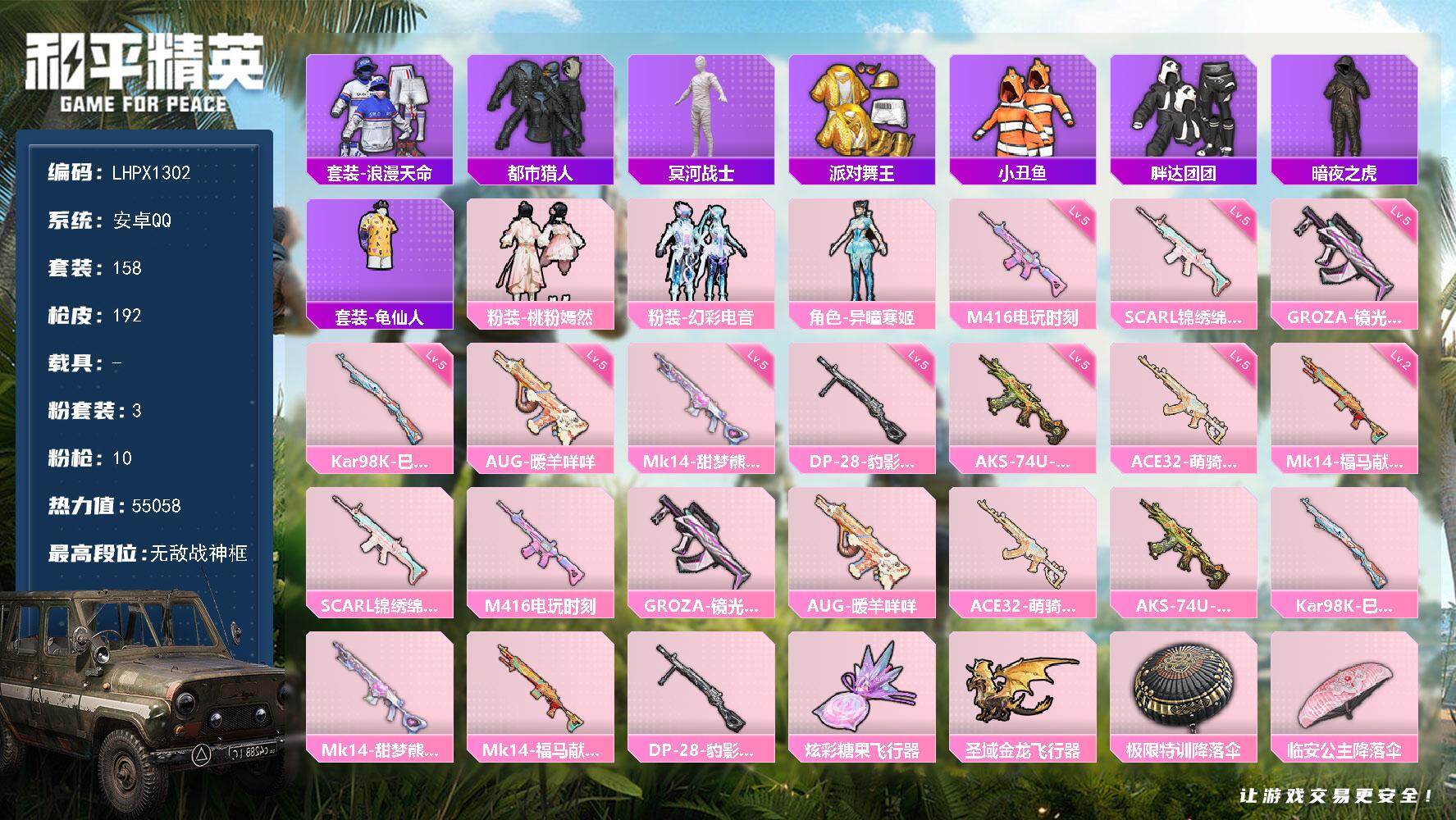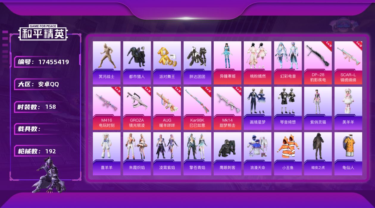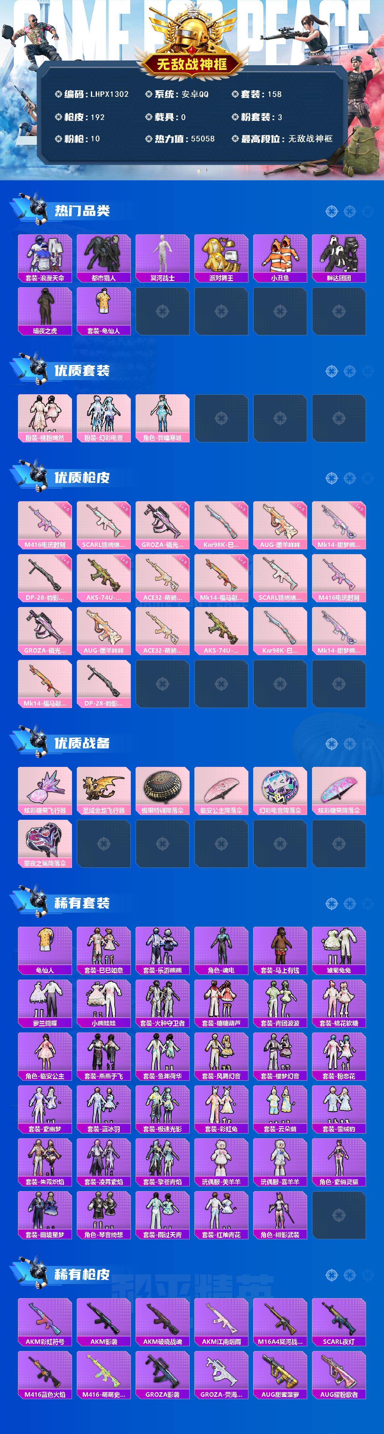 - [16946694]安卓 手Q-9粉装-5特效枪-0载具-2粉色飞行器-47975热力值-10王牌印记-133套装-152枪皮 【热门品类】:套装-龟仙人 【粉色套装】:粉装-星之彼岸,粉装-傲雪凌霜,角色-猩猩队长,角色-樱桃泡泡,角色-智耀战神,角色-奇迹舞步 雅雅,角色-奇迹舞步 美琪,角色-奇迹舞步 美雪,角色-冰魄 【粉色枪皮等级】:AKM-绿萝繁花(五级),SCAR-L-锦绣绵绵(五级),P90-金丰海韵(七级),Kar98K-巳巳如意(五级),DP-28-豹影疾电(五级) 【粉色枪皮】:AKM-绿萝繁花,SCAR-L-锦绣绵绵,P90-金丰海韵,Kar98K-巳巳如意,DP-28-豹影疾电 【粉色飞行器】:炫彩糖果飞行器,镜光幻境飞行翼 【粉色降落伞】:星之信仰降落伞,甜心娃娃降落伞,第五大道降落伞,未来歌姬降落伞,炫光之旅降落伞,精灵梦叶罗丽降落伞,临安公主降落伞,鬼刀降落伞,奇迹舞步降落伞,炫彩糖果降落伞 【稀有套装】:套装-龟仙人,套装-巳巳如意,套装-炫彩糖果,角色-许七安,套装-燕燕于飞,套装-鱼渊荷华,套装-极速光影,套装-朱霞炽焰,套装-凌霄紫焰,角色-紫俏灵猫 【稀有枪皮】:AKM-影袭,AKM-虎虎生威,AKM-龙的传人,SCAR-L-粉锦千层,M416-糯团青竹,GROZA-影袭,GROZA-懵萌河马,AUG-2P战斗服款,AUG-天降萌叽,AUG-甜蜜菠萝,QBZ-未来歌姬,Mk47-妙红点点,G36C-懵萌河马,AC-VAL-快闪甜心,蜜獾-千面幻镜,蜜獾-天降萌叽,ARX-凌霄紫焰,UZI-啾咪啾咪,UZI-影袭,UMP45-涂山之恋,UMP45-炫光之旅,Vector-彩虹符号,Vector-生命誓言,汤姆逊-天降萌叽,汤姆逊-耀粉歌者,野牛-沙丘之主,AKS-74U-鬼刀,JS9-凌霄紫焰,P90-快闪甜心,P90-巳巳如意,Kar98K-影袭,Kar98K-星穹咏叹调,M24-影袭,M24-幻彩电音,M24-樱桃泡泡,AWM-圣堂之誓,AWM-奇迹舞步,SKS-未来歌姬,SKS-炫彩节奏,莫辛纳甘-懵萌河马,AMR-妙红点点,AMR-喜羊羊与灰太狼,M417-惊鸿侠骨,M417-猪猪侠,MK20-H-快闪甜心,M200-惊鸿侠骨,S686-生命誓言,S686-巳巳如意,S12K-玩趣呆呆,S12K-智耀战神,DBS-圣堂之誓,DBS-彩虹