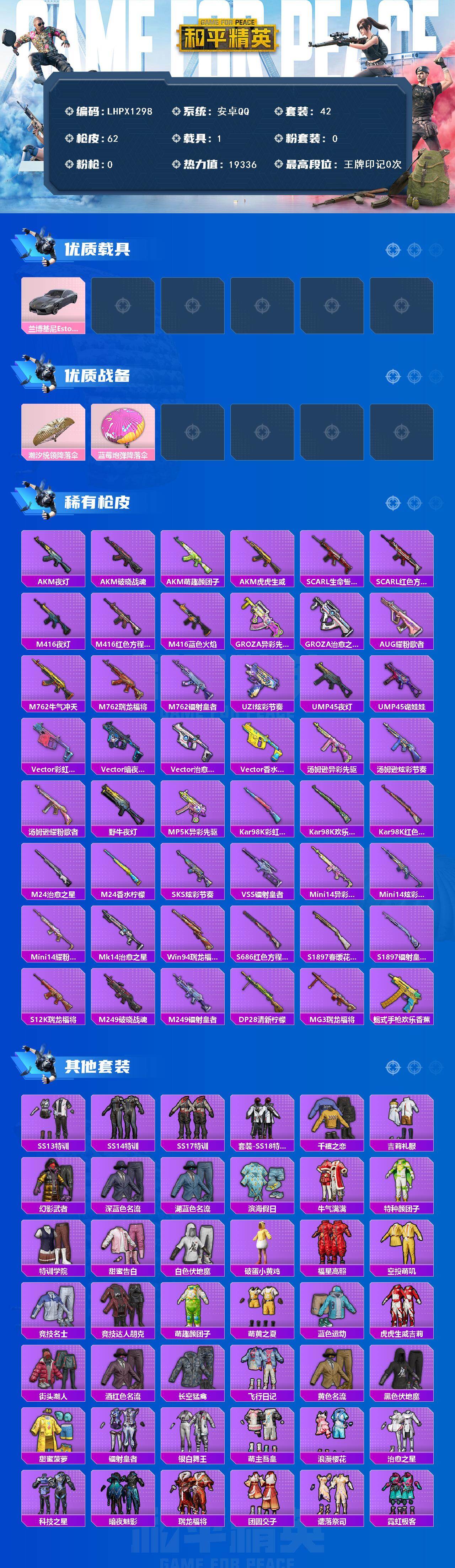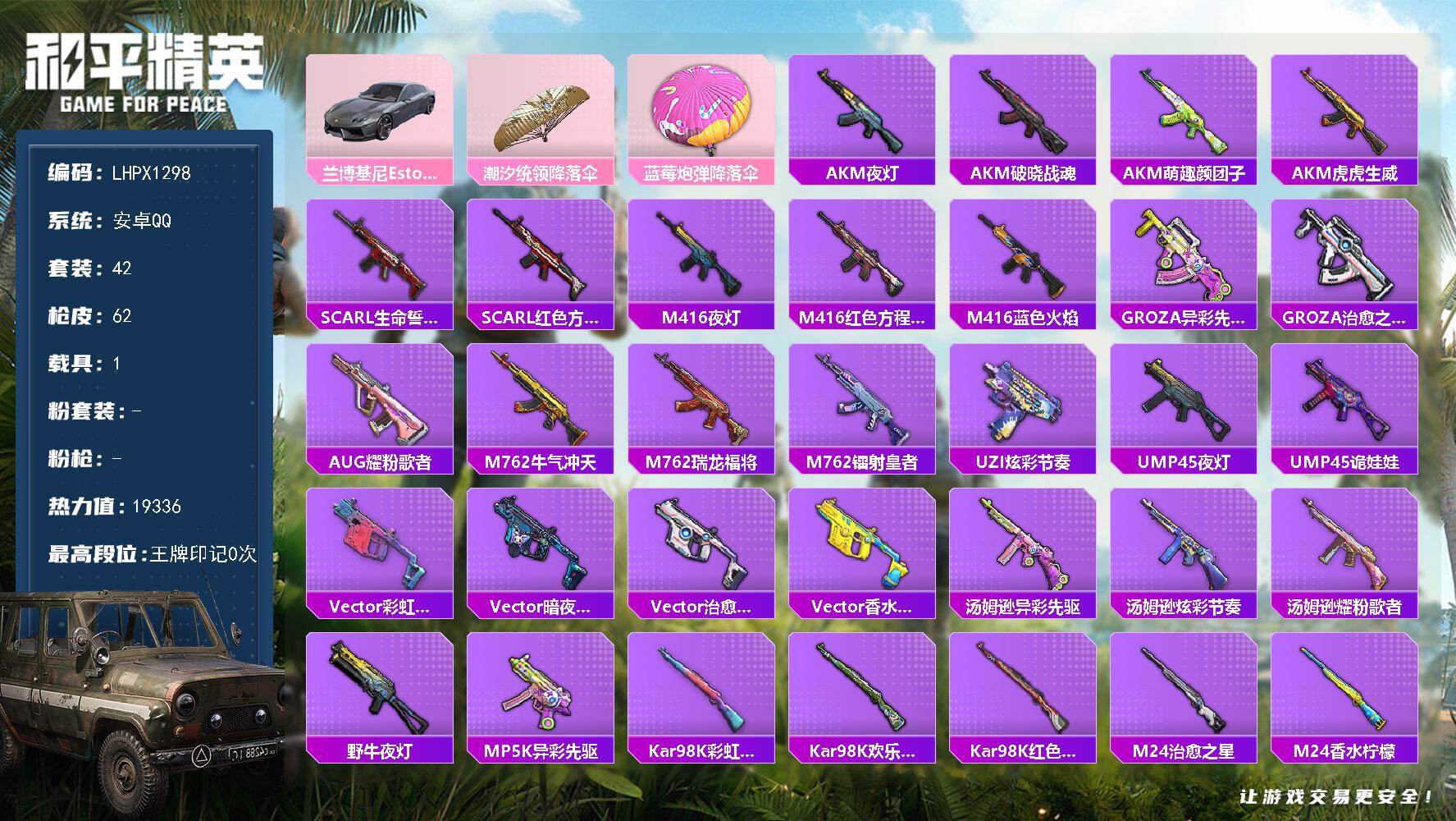 - [16459830]【特价出售/店主推荐】安卓 手Q-3粉装-3特效枪-2载具-0粉色飞行器-52818热力值-11王牌印记-134套装-179枪皮 【热门品类】:套装-浪漫天命,套装-都市猎人,套装-深海小丑鱼,套装-奇异狩猎者,套装-胖达团团,套装-动感兔斯基人偶服,套装-龟仙人,套装-暗影哥特 【粉色套装】:粉装-天使彩虹糖,粉装-海渊国主,角色-复仇流浪者 【粉色枪皮等级】:M416-心之恋语(七级),Kar98K-巳巳如意(五级),DP-28-豹影疾电(三级) 【粉色载具】:迈凯伦570S(旭日黄),保时捷Cayenne(激情红) 【粉色枪皮】:M416-心之恋语,Kar98K-巳巳如意,DP-28-豹影疾电 【粉色降落伞】:未来战士降落伞,碧影闪光降落伞,翩跹演武降落伞,暗夜鎏金降落伞,沙丘之主降落伞,星穹咏叹调降落伞,幻彩电音降落伞,异瞳寒姬降落伞 【稀有套装】:套装-龟仙人,套装-雪国风尚,套装-雏菊兔兔,套装-萝兰蝴蝶,套装-小熊娃娃,角色-米开朗基罗,套装-星影赞美诗,套装-星渊小夜曲,套装-书海巡游,套装-画境星梦,套装-琴音绮想 【稀有枪皮】:AKM-奇异狩猎者,AKM-影袭,AKM-灼热熔岩,AKM-环太平洋,AKM-缤纷海域,AKM-霓虹街区,AKM-龙的传人,M16A4-幻世战舞者,M16A4-甜心亚梦,SCAR-L-炫彩节奏,SCAR-L-玉兔迎春,SCAR-L-红色方程式,M416-糯团青竹,M416-红色方程式,M416-蓝色火焰,GROZA-影袭,GROZA-懵萌河马,GROZA-田园牧歌,AUG-天降萌叽,AUG-幻影战神,AUG-耀粉歌者,QBZ-飞驰魅影,M762-天降萌叽,M762-奇异狩猎者,M762-暗夜鎏金,Mk47-妙红点点,G36C-懵萌河马,G36C-炙焰牛王,G36C-星穹咏叹调,AC-VAL-天降萌叽,AC-VAL-快闪甜心,AC-VAL-甜心亚梦,蜜獾-垂柳戏鸭,蜜獾-天降萌叽,蜜獾-娇憨猪猪,ACE32-画境星梦,UZI-啾咪啾咪,UZI-天降萌叽,UZI-娇憨猪猪,UZI-幻影战神,UZI-影袭,UZI-炫彩节奏,UZI-红色方程式,UMP45-涂山之恋,UMP45-生命誓言,UMP45-蓝色火焰,UMP45-绒宝小鹅,UMP45-极意拳锋,Vector-焰鹰斗篷,Vector-生命誓言,Vector-田园牧歌,Ve