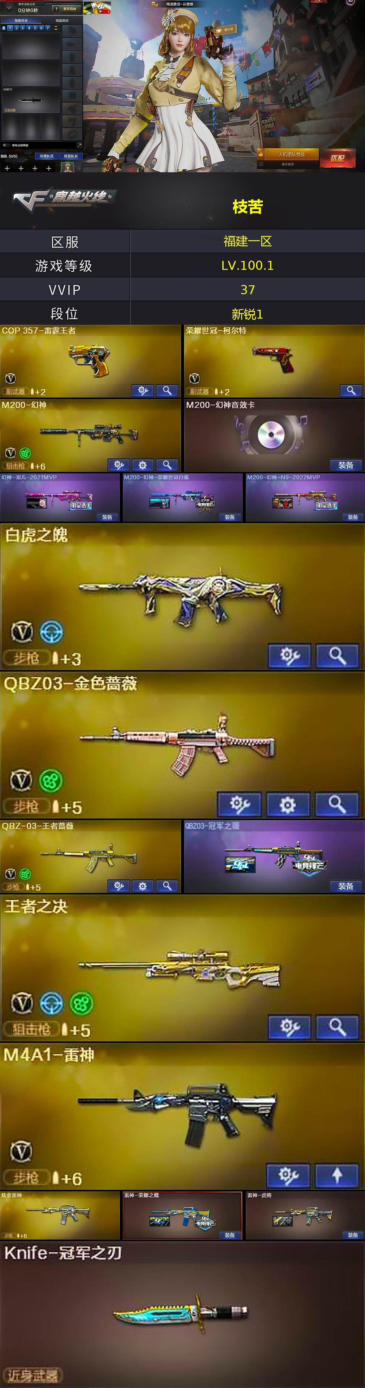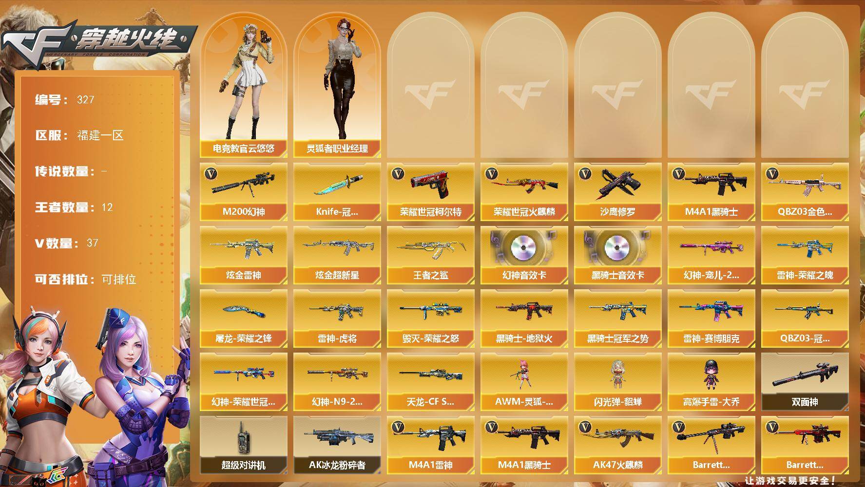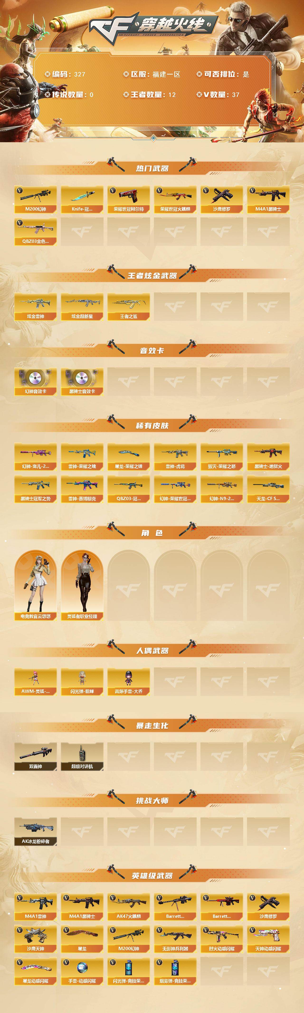 [17322934]福建一区-37V-12王者-2炫金 【角色】:灵狐者-职业经理,电竞教官-云悠悠 【热门武器】:M200-幻神,Knife-冠军之刃,荣耀世冠-柯尔特,荣耀世冠-火麒麟,沙鹰-修罗,沙鹰-修罗,M4A1-黑骑士 【王者炫金武器】:炫金雷神,炫金超新星,王者之鲨 【稀有皮肤】:雷神-荣耀之魄,屠龙-荣耀之锋,雷神-虎将,毁灭-荣耀之怒,幻神-宠儿-2021MVP,黑骑士-地狱火,黑骑士-冠军之势,雷神-赛博朋克,QBZ03-冠军之薇,M200-幻神-荣耀世冠白鲨,M200-幻神-N9-2022MVP,天龙-CFSTAR,M200-庆典-CFS 2021 【其他皮肤】:QBZ03-吕布,AK47-B-身先士卒,AK47-B-常胜将军-曹操,AK47-青龙,98K-幻能朋克,加特林-炼狱-掌火 【人偶武器】:AWM-灵狐-15周年嘉年华,闪光弹-貂蝉,高爆手雷-大乔 【音效卡】:黑骑士音效卡,幻神音效卡 【挑战大师】:AK47-冰龙粉碎者 【暴走生化】:双面神,超级对讲机 【英雄级武器】:M4A1-雷神,无影-神兵利器,烈火-动感闪耀,天神-动感闪耀,屠龙-动感闪耀,手雷-动感闪耀,闪光弹-竞技荣光,闪光弹-竞技荣光,闪光弹-竞技荣光,烟雾弹-竞技荣光,烟雾弹-竞技荣光,烟雾弹-竞技荣光,M4A1-黑骑士,AK47-火麒麟,Barrett-毁灭,Barrett-极光,沙鹰-修罗,沙鹰-修罗,沙鹰-天神,沙鹰-天神,屠龙,屠龙,屠龙,M200-幻神,QBZ03-金色蔷薇 【特殊枪械】:0白虎,1黑骑士,0烈龙,0盘龙,0炼狱,0蝴蝶斯泰尔