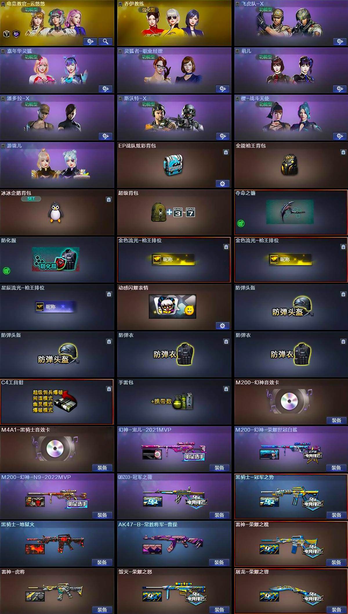 - [15420872]南方大区-40V-13王者-2炫金 【热门武器】:M200-幻神,QBZ-03-王者蔷薇,M200-竞技荣光,M4A1-黑骑士,汤姆逊-烈龙,RPK-盘龙,USP-雷暴,沙鹰-修罗 【王者炫金武器】:QBZ-03-王者蔷薇,炫金黑龙,炫金毁灭,王者之魄高爆手雷*2,王者之魄闪光弹*2 【音效卡】:AK47-火麒麟音效卡,M4A1-黑骑士音效卡,Barrett-毁灭音效卡 【皮肤】:烈龙-星空,雷神-能量核心,雷神-烈虎皮肤,火麒麟-雷神,AK47-火麒麟-传奇EVEN,火麒麟-轻羽皮肤,毁灭-星空,毁灭-CFS2020,毁灭-SV-CFPLS16冠军,毁灭-BEAN-2020MVP,毁灭-黑大圣皮肤,M4A1-千变-孔明皮肤,黑龙-墨子皮肤,黑骑士-CFS2021,黑骑士-伏羲,AK47-B-常胜将军-孙权,屠龙-荣耀之锋,龙啸-冠军之啸 【角色】:电竞教官-云悠悠,王者-葵-貂蝉,王者涂鸦,虎妞,零-水下丽影,潘多拉-X,蜀雪,职业选手 【人偶武器】:COP-旗袍,深渊终结者手雷,闪光弹-小乔,闪光弹-貂蝉,高爆手雷-大乔 【英雄级武器】:AK47-火麒麟,M4A1-雷神,M4A1-黑骑士,AK47-无影,M4A1-玫瑰精灵,M4A1-猎神,王者之翼-觉醒版,王者之势-觉醒版,超新星-悦享-觉醒版,王者火魄-觉醒版,黑骑士-海王,AK47-B-常胜将军,Barrett-毁灭,M200-幻神,M200-竞技荣光,Barrett-金色蔷薇,王者之力-觉醒版,RPK-盘龙,汤姆逊-烈龙,沙鹰-修罗,沙鹰-天神,USP-雷暴,柯尔特-竞技荣光,屠龙,龙啸,麒麟刺-堕天神,擎天,麒麟刺,幻灵之锋,擎天-竞技荣光,龙啸-堕天神,高爆手雷-堕天神*2,高爆手雷-竞技荣光,闪光弹-堕天神*2,闪光弹-竞技荣光,闪光弹-雷霆王者-觉醒版,烟雾弹-堕天神*2,烟雾弹-竞技荣光 【道具】:热带奇洋炫彩背包,背包-葫芦兄弟,超级背包,绿色巨人,灵魂忍者,迷雾幽灵,夺命之镰,防化服*2,枪王排位28赛季金色流光,枪王排位29赛季金色流光,防弹头盔*2,防弹衣*2,C4工具钳*2,手雷包*2 【特殊枪械】:1黑骑士,1烈龙,1盘龙