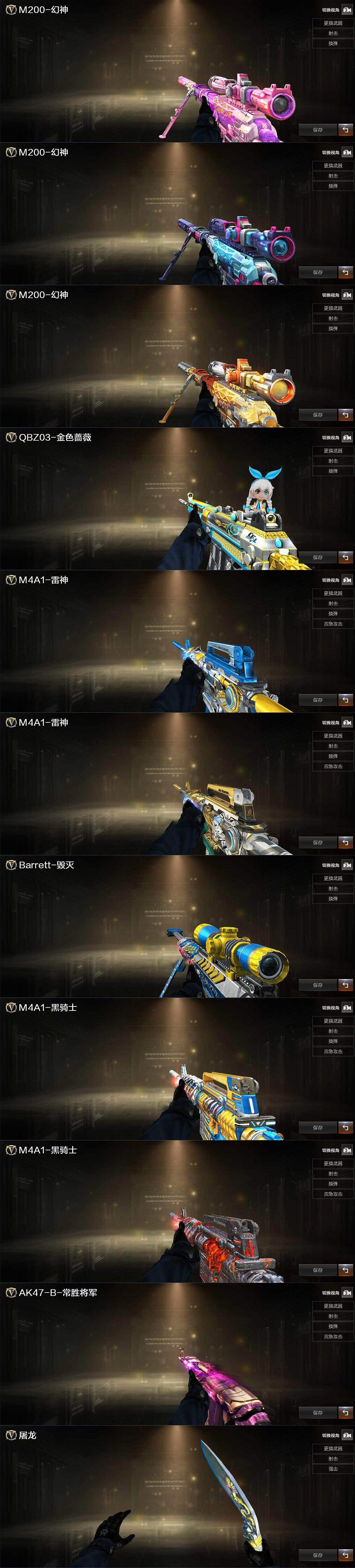 【稀有皮肤】:雷神-荣耀之魄,屠龙-荣耀之锋,雷神-虎将,毁灭-荣耀之怒,幻神-宠儿-2021MVP,黑骑士-地狱火,黑骑士-冠军之势,雷神-赛博朋克,QBZ03-冠军之薇,M200-幻神-荣耀世冠白鲨,M200-幻神-N9-2022MVP,天龙-CFSTAR,M200-庆典-CFS 2021