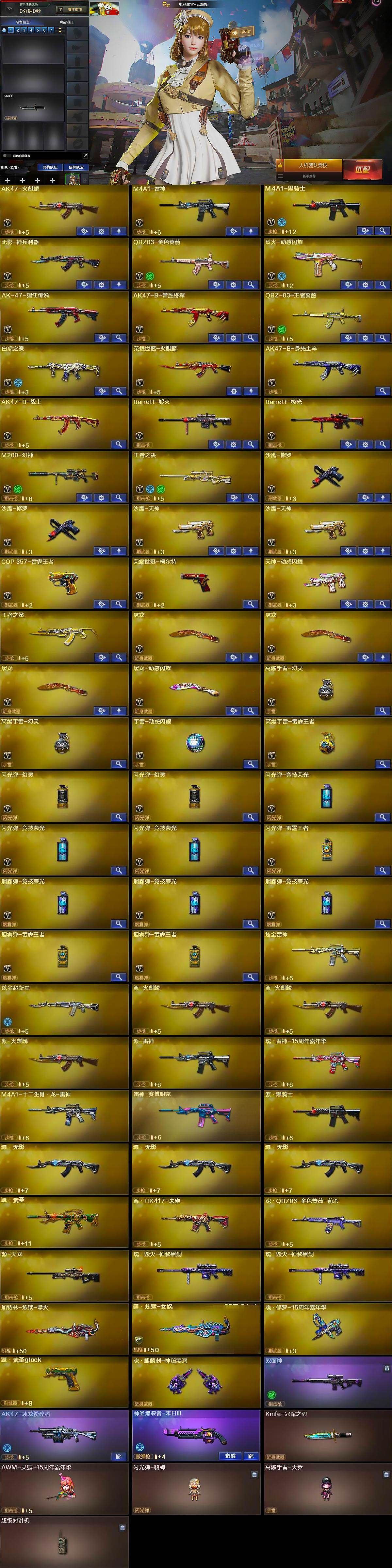 【英雄级武器】:M4A1-雷神,无影-神兵利器,烈火-动感闪耀,天神-动感闪耀,屠龙-动感闪耀,手雷-动感闪耀,闪光弹-竞技荣光,闪光弹-竞技荣光,闪光弹-竞技荣光,烟雾弹-竞技荣光,烟雾弹-竞技荣光,烟雾弹-竞技荣光,M4A1-黑骑士,AK47-火麒麟,Barrett-毁灭,Barrett-极光,沙鹰-修罗,沙鹰-修罗,沙鹰-天神,沙鹰-天神,屠龙,屠龙,屠龙,M200-幻神,QBZ03-金色蔷薇
