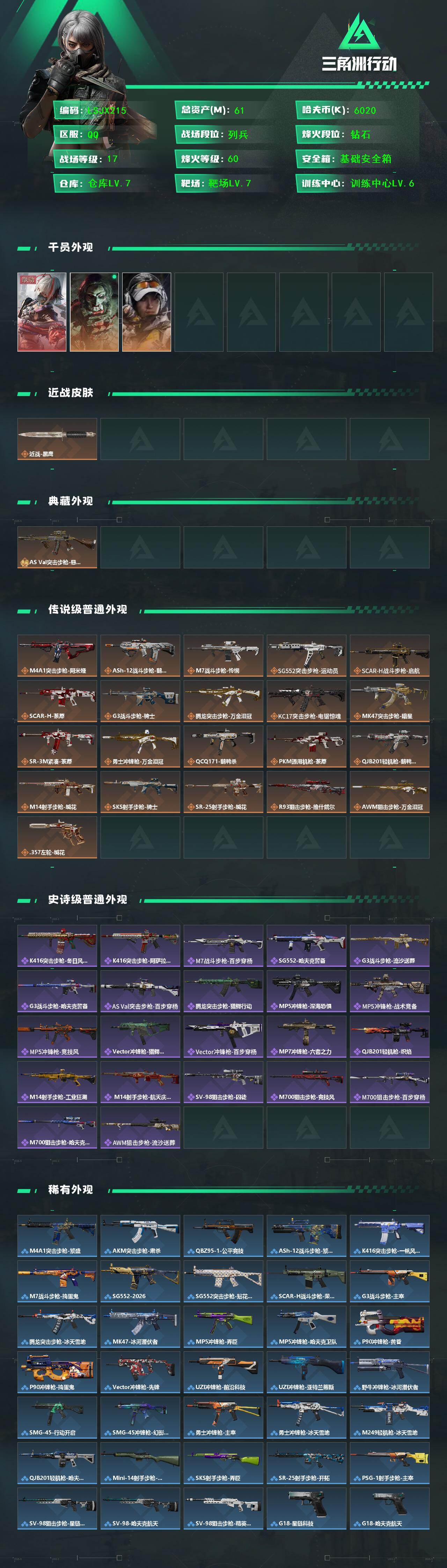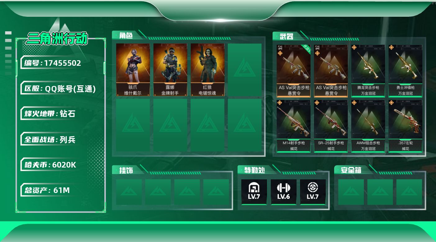 [17455502]可二次【特价出售/店主推荐】61m总资产-6020k哈伏币-60烽火等级-钻石-17战场等级-列兵 【干员外观】:骇爪-维什戴尔,红狼-电锯惊魂,露娜-金牌射手 【近战皮肤】:近战-黑鹰 【典藏外观】:AS Val突击步枪-悬赏令 【典藏外观成色】:AS Val突击步枪-悬赏令(优品S) 【传说外观】:M4A1突击步枪-阿米娅,ASh-12战斗步枪-鹅鸭杀,M7战斗步枪-怜悯,SG552突击步枪-运动员,SCAR-H战斗步枪-启航,SCAR-H战斗步枪-荼蘼,G3战斗步枪-骑士,腾龙突击步枪-万金泪冠,KC17突击步枪-电锯惊魂,MK47突击步枪-暗星,SR-3M紧凑突击步枪-荼蘼,勇士冲锋枪-万金泪冠,QCQ171冲锋枪-鹅鸭杀,PKM通用机枪-荼蘼,QJB201轻机枪-鹅鸭杀,M14射手步枪-缄花,SKS射手步枪-骑士,SR-25射手步枪-缄花,R93狙击步枪-维什戴尔,AWM狙击步枪-万金泪冠,.357左轮-缄花 【史诗外观】:K416突击步枪-冬日风情,K416突击步枪-阿萨拉特攻,M7战斗步枪-百步穿杨,SG552突击步枪-哈夫克警备,G3战斗步枪-流沙送葬,G3战斗步枪-哈夫克警备,AS Val突击步枪-百步穿杨,腾龙突击步枪-猎鳄行动,MP5冲锋枪-深海恐惧,MP5冲锋枪-战术竞备,MP5冲锋枪-竞技风,Vector冲锋枪-猎鳄行动,Vector冲锋枪-百步穿杨,MP7冲锋枪-六套之力,QJB201轻机枪-炽焰,M14射手步枪-工业狂潮, M14射手步枪-航天庆典,SV-98狙击步枪-囚徒,M700狙击步枪-竞技风,M700狙击步枪-百步穿杨,M700狙击步枪-哈夫克警备,AWM狙击步枪-流沙送葬 【稀有外观】:M4A1突击步枪-繁盛,AKM突击步枪-肃杀,QBZ95-1突击步枪-公平竞技,ASh-12战斗步枪-繁盛,K416突击步枪-一帆风顺,M7战斗步枪-捣蛋鬼,SG552突击步枪-2026,SG552突击步枪-贴花艺术,SCAR-H战斗步枪-荣耀列队,G3战斗步枪-主宰,腾龙突击步枪-冰天雪地,MK47突击步枪-冰河潜伏者,MP5冲锋枪-弄臣,MP5冲锋枪-哈夫克卫队,P90冲锋枪-黄昏,P90冲锋枪-捣蛋鬼,Vector冲锋枪-先锋,UZI冲锋枪-前沿科技,UZI冲锋枪-亚特兰蒂斯,野牛冲锋枪-冰河潜伏者,SMG-45冲锋枪-行动开启,SMG