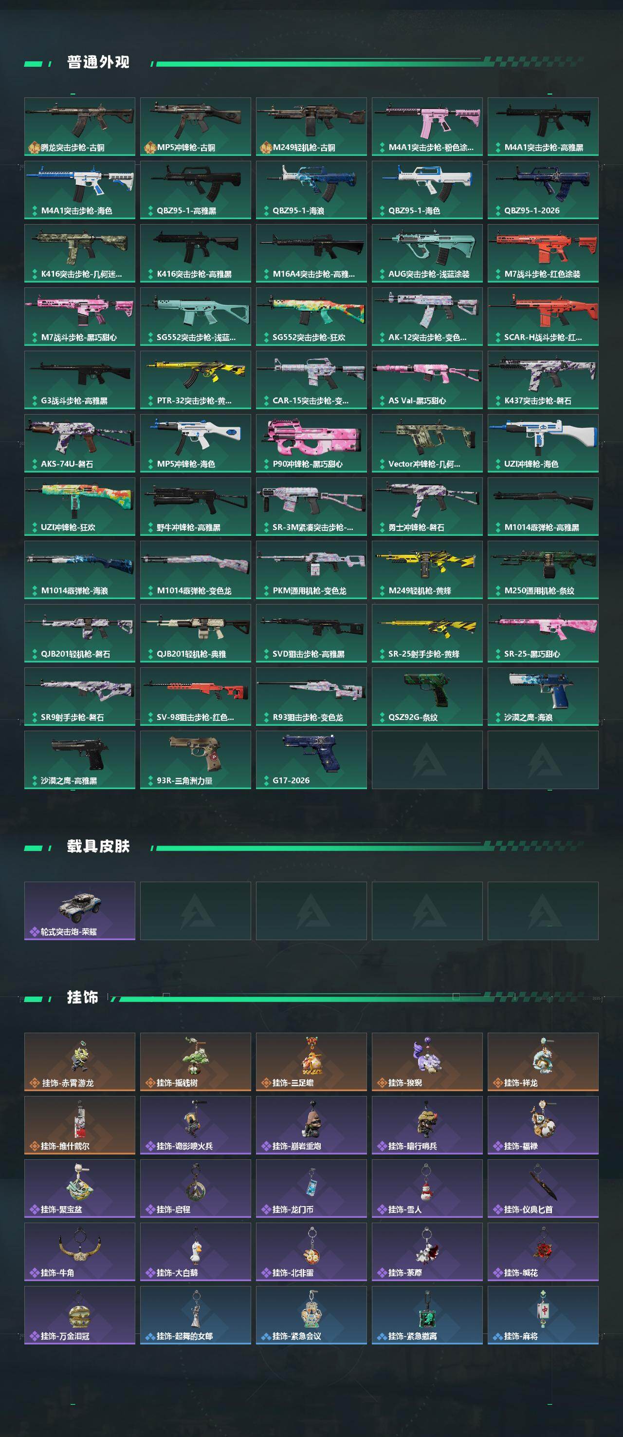 【史诗外观】:K416突击步枪-冬日风情,K416突击步枪-阿萨拉特攻,M7战斗步枪-百步穿杨,SG552突击步枪-哈夫克警备,G3战斗步枪-流沙送葬,G3战斗步枪-哈夫克警备,AS Val突击步枪-百步穿杨,腾龙突击步枪-猎鳄行动,MP5冲锋枪-深海恐惧,MP5冲锋枪-战术竞备,MP5冲锋枪-竞技风,Vector冲锋枪-猎鳄行动,Vector冲锋枪-百步穿杨,MP7冲锋枪-六套之力,QJB201轻机枪-炽焰,M14射手步枪-工业狂潮, M14射手步枪-航天庆典,SV-98狙击步枪-囚徒,M700狙击步枪-竞技风,M700狙击步枪-百步穿杨,M700狙击步枪-哈夫克警备,AWM狙击步枪-流沙送葬