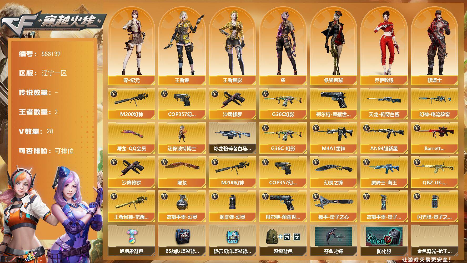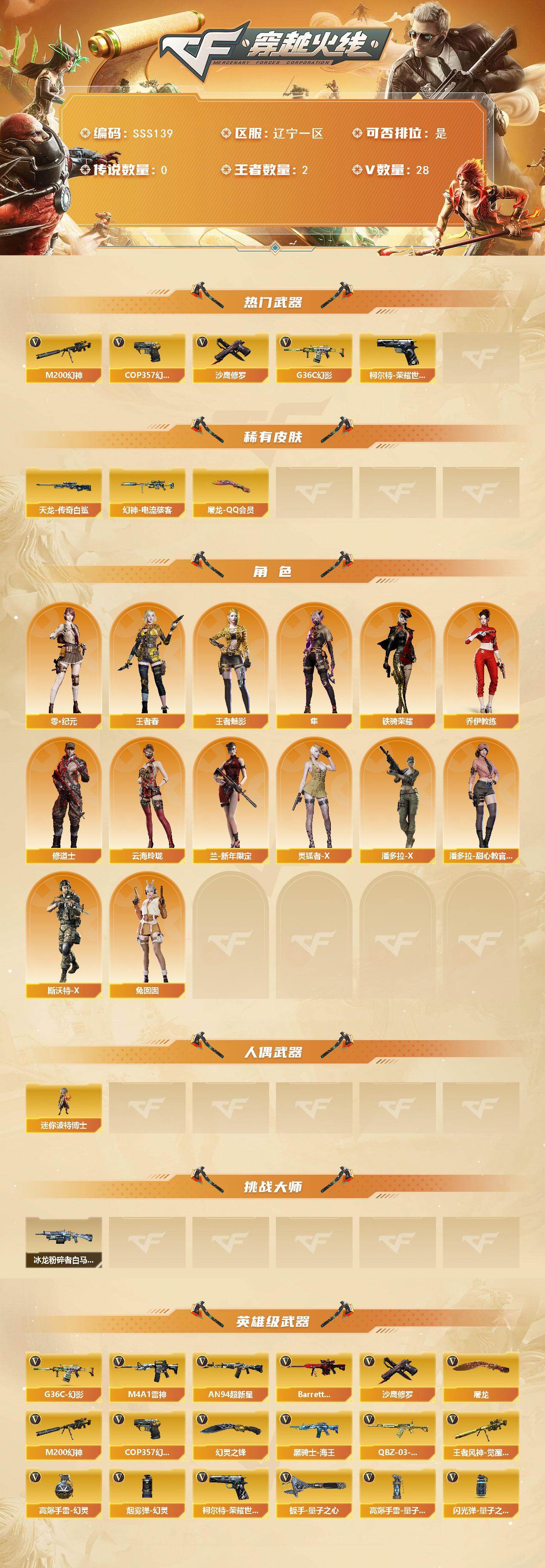 [17455675]辽宁一区-31V-2王者武器数-0炫金武器数 【热门武器】:G36C-幻影,M200-幻神,柯尔特-荣耀世冠白鲨2023,COP 357-幻灵,沙鹰-修罗*5 【皮肤】:幻神-电流骇客 皮肤,AWM-天龙-传奇白鲨,屠龙-QQ会员 【角色】:隼,零·纪元,王者春,王者-魅影,乔伊教练,修道士,云海玲珑,兰-新年限定,灵狐者-X,潘多拉-X,潘多拉-甜心教官,斯沃特-X,铁骑荣耀,兔囡囡 【人偶武器】:迷你波特博士 【挑战大师】:冰龙粉碎者-白马银枪*2 【英雄级武器】:M4A1-雷神,AN94-超新星,G36C-幻影,黑骑士-海王,QBZ-03-王者蔷薇-觉醒版,机械迷城-穹宇,Barrett-极光,M200-幻神,王者风神-觉醒版,沙鹰-修罗*5,COP 357-幻灵,柯尔特-荣耀世冠白鲨2023,屠龙,幻灵之锋,扳手-量子之心,屠龙-斗烈龙驹,高爆手雷-幻灵*3,高爆手雷-量子之心,闪光弹-量子之心,烟雾弹-幻灵 【源级武器】:源·雷神,魂·M4A1-雷神-化蛇,魂·雷神-神秘按键,魂·雷神-新春神龙*2,源·武圣,源·机械迷城*2,魂·HK417-朱雀-凤灵,魂·英雄-湾区光枢,Barrett-极光-掌火,魂·裁决-新人王绿豆,魂·裁决-羽掣,魂·毁灭-航天科技,魂·Barrett-朱雀- 新春神龙*2,源·Barrett-朱雀,灵·Barrett-朱雀-炫光,魂·炼狱-玩具枪,魂·修罗-现代金属,魂·天神-宇航兔兔,灵·天神-穹宇,源·武圣glock,魂·屠龙-惊鸿*2,魂·龙啸-NICE,魂·龙啸-秦师*2,灵·麒麟刺-穹宇 【道具】:泡泡象背包,BS战队炫彩背包,热带奇洋炫彩背包,超级背包,夺命之镰,防化服,金色流光-枪王排位,星辰流光-枪王排位,循环实验表情,防弹头盔,防弹衣,C4工具钳,手雷包 【特殊枪械】: