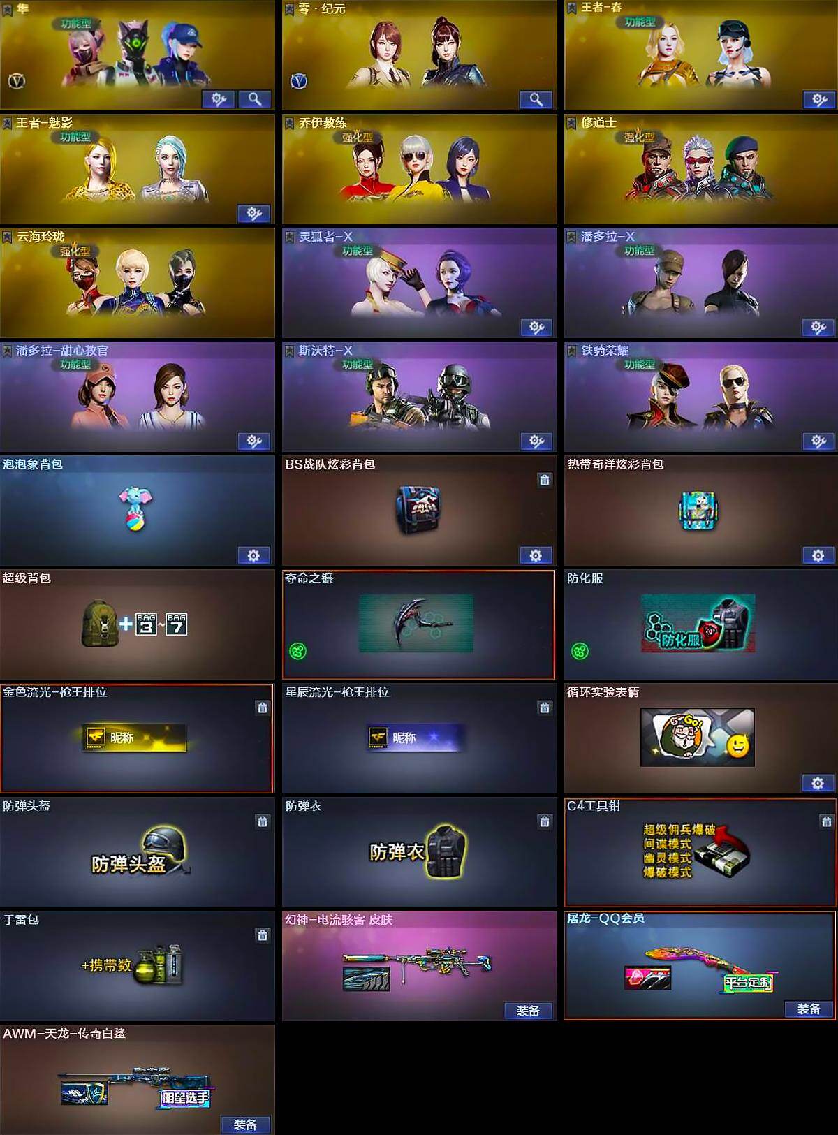 【道具】:泡泡象背包,BS战队炫彩背包,热带奇洋炫彩背包,超级背包,夺命之镰,防化服,金色流光-枪王排位,星辰流光-枪王排位,循环实验表情,防弹头盔,防弹衣,C4工具钳,手雷包