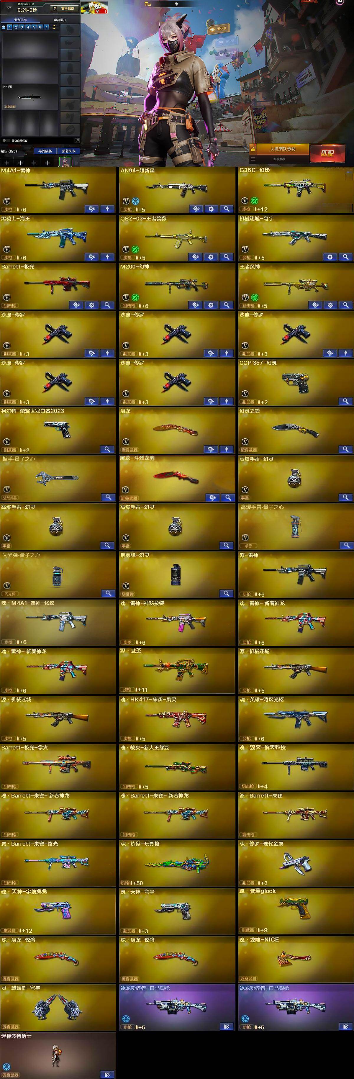 【英雄级武器】:M4A1-雷神,AN94-超新星,G36C-幻影,黑骑士-海王,QBZ-03-王者蔷薇-觉醒版,机械迷城-穹宇,Barrett-极光,M200-幻神,王者风神-觉醒版,沙鹰-修罗*5,COP 357-幻灵,柯尔特-荣耀世冠白鲨2023,屠龙,幻灵之锋,扳手-量子之心,屠龙-斗烈龙驹,高爆手雷-幻灵*3,高爆手雷-量子之心,闪光弹-量子之心,烟雾弹-幻灵